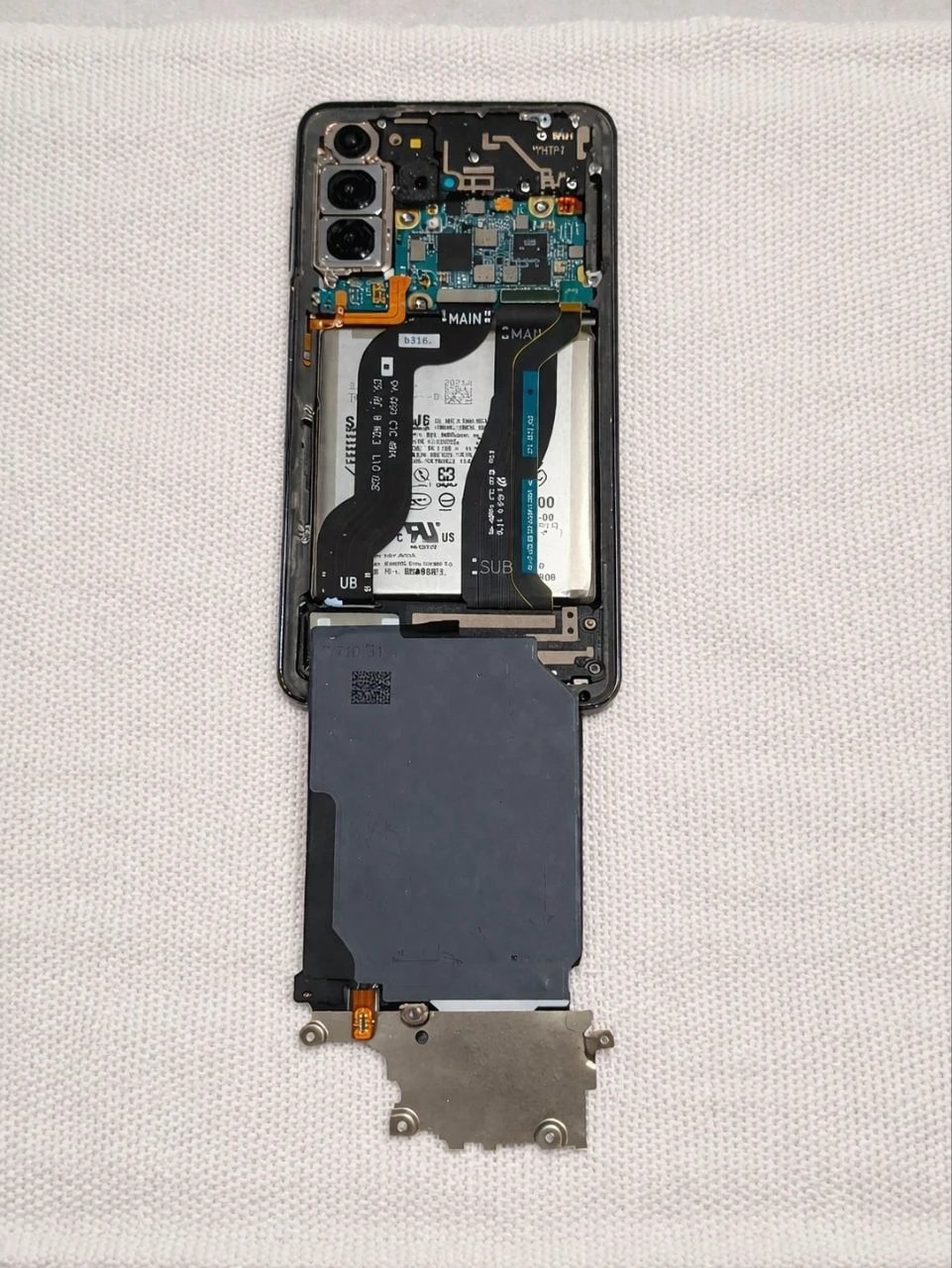Original screen (minor scratches) and cameras are good; small frame dent. Motherboard is dead with heatsinks removed; memory chip will be physically destroyed before sale for data privacy.