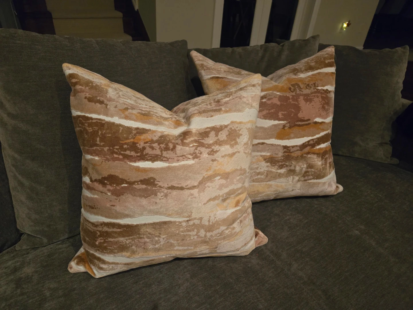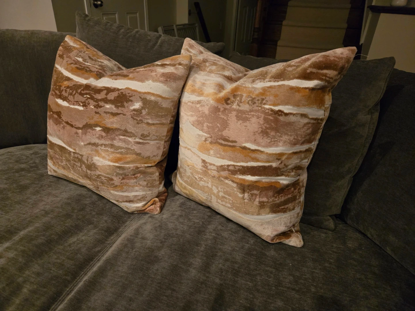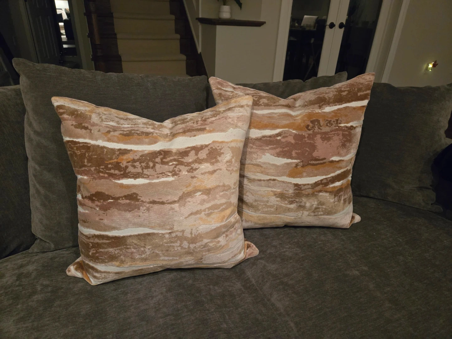 Selling a set of two decorative throw pillows! They have a unique, textured pattern in shades of brown, beige, and white. These pillows are in great condition and would add a touch of warmth to any living space!