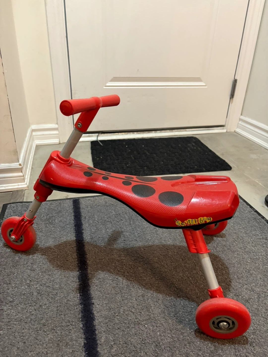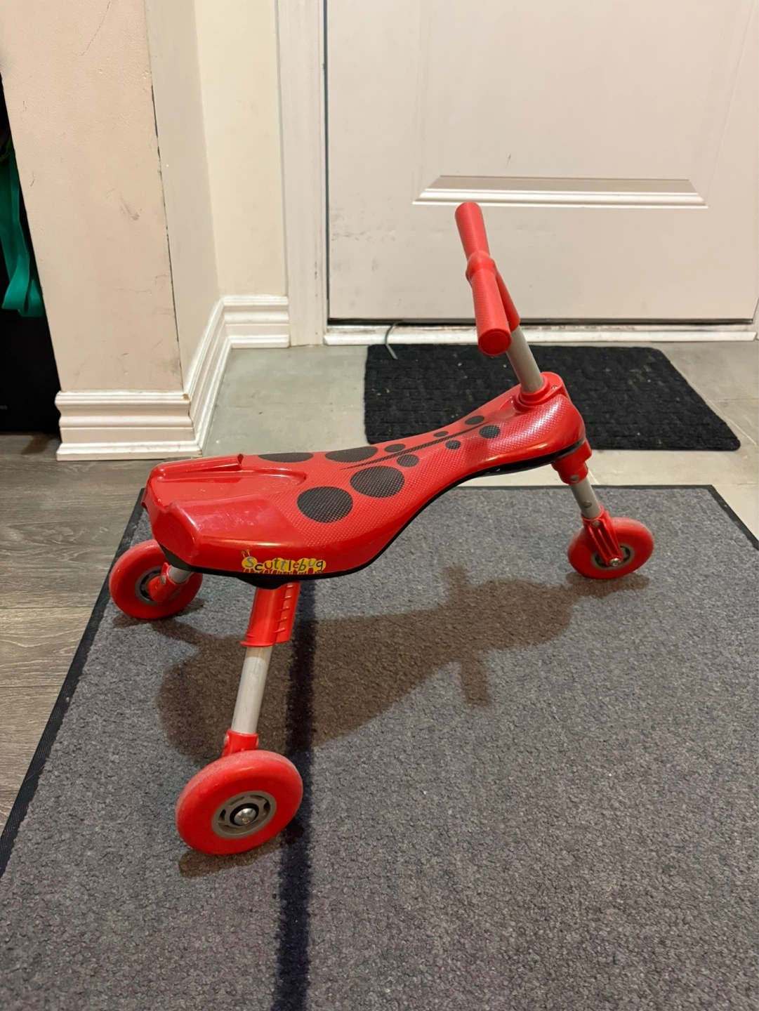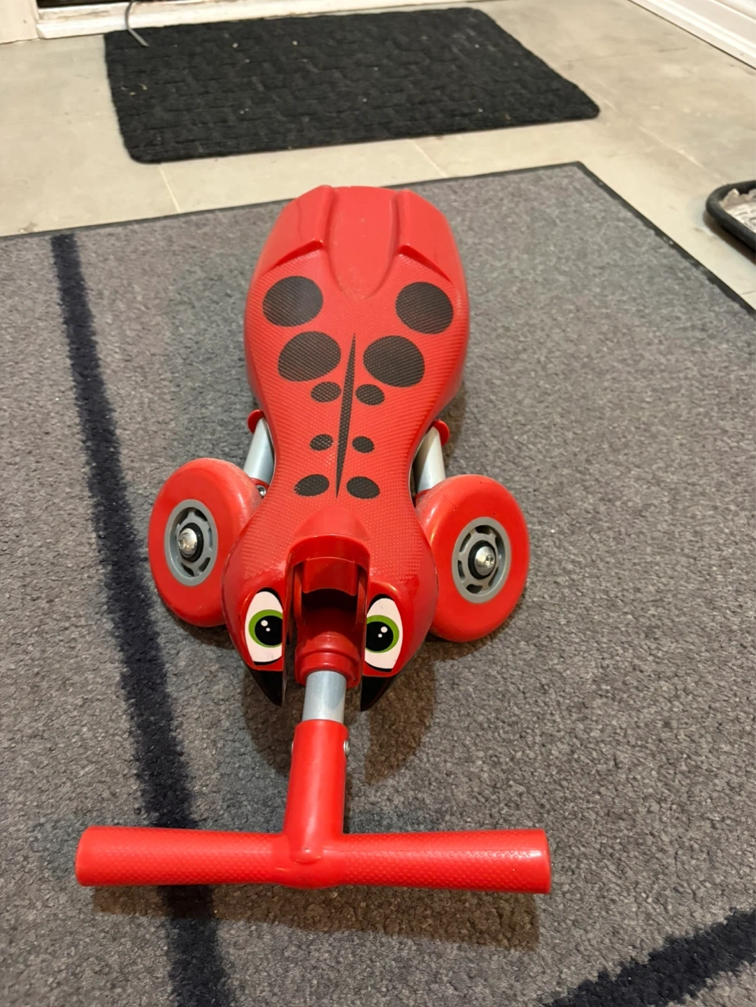 This is a fun red ride-on toy designed to look like a ladybug. It features a ladybug design with black spots and eyes. It has four wheels for stability.