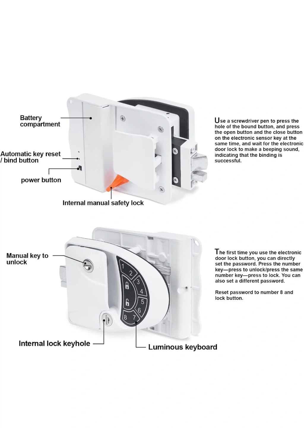It features a backlit keypad and comes with 2 electronic induction keys, 4 keys, and a screwdriver. It's designed to fit a 2.75" x 3.75" lock hole. The package includes clear instructions for installing and programming your RV door lock