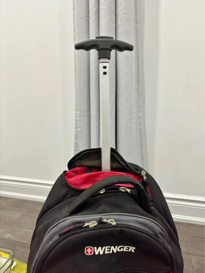 Sturdy wheeled travel bag with retractable handle. Smooth-rolling wheels. Spacious main compartment with interior pockets for organization. Light cosmetic wear from normal use, but works perfectly. Great for trips, travel, or business use. No backpack straps.