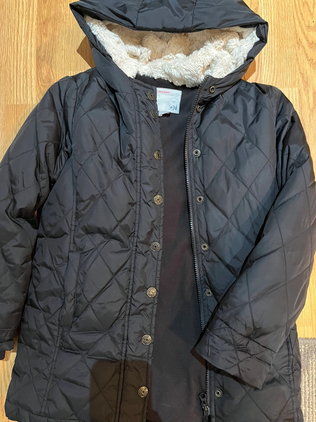 Cozy up this winter with this kids black Old Navy jacket! It's a size L/G and features a warm, sherpa-lined hood
