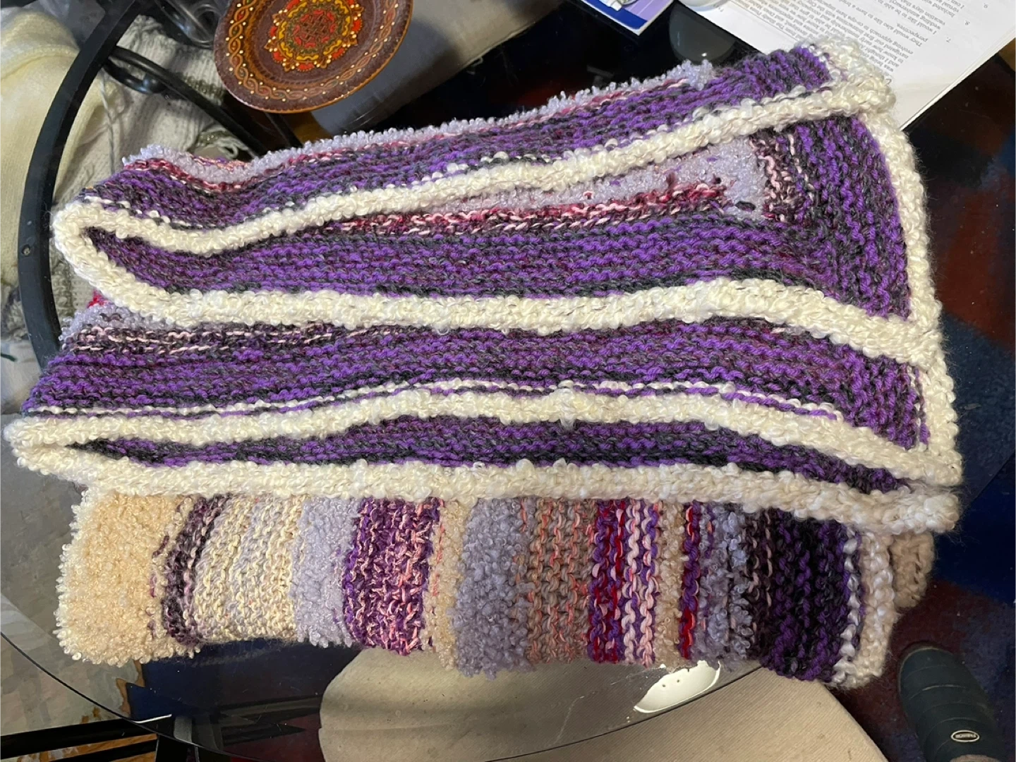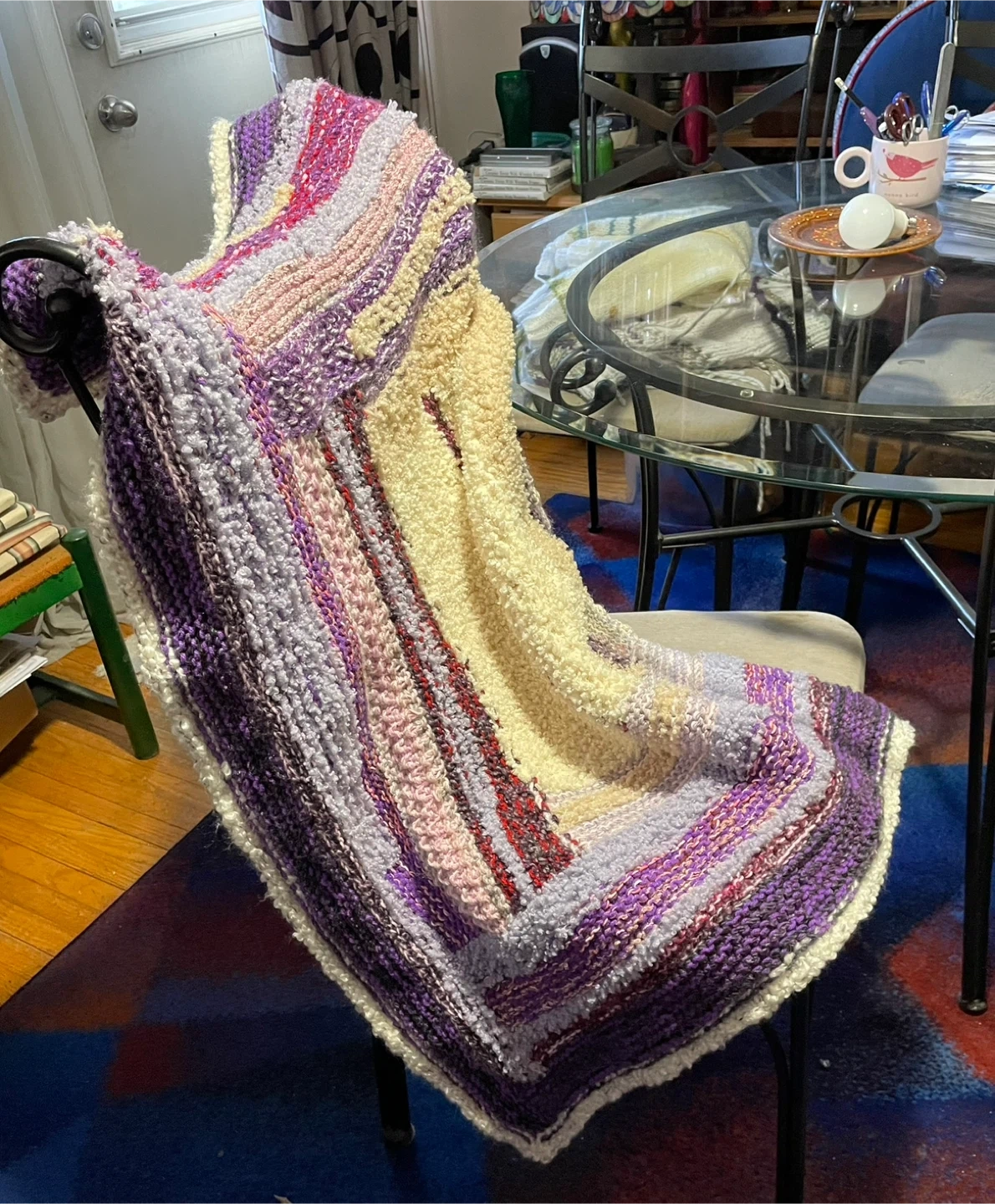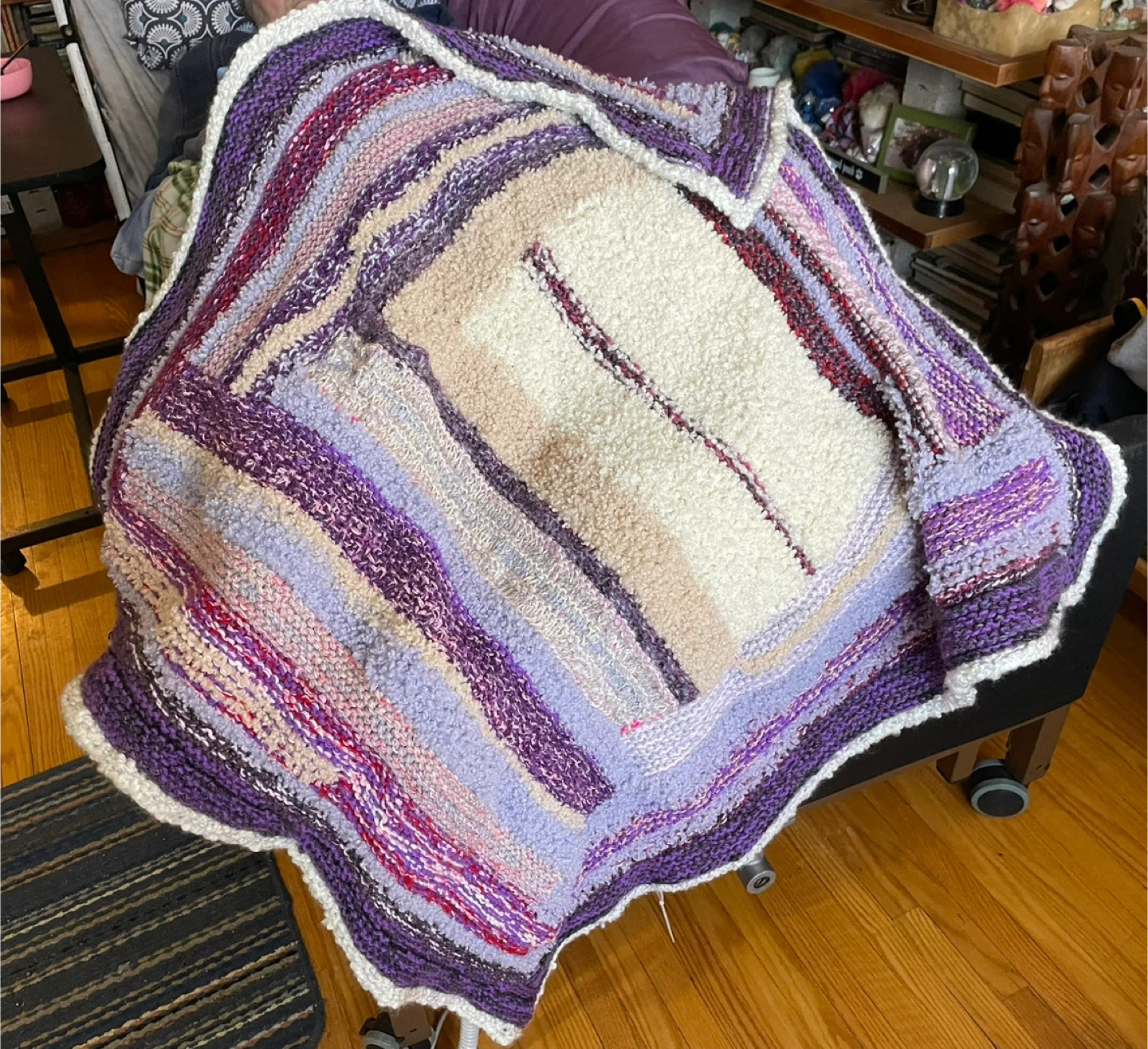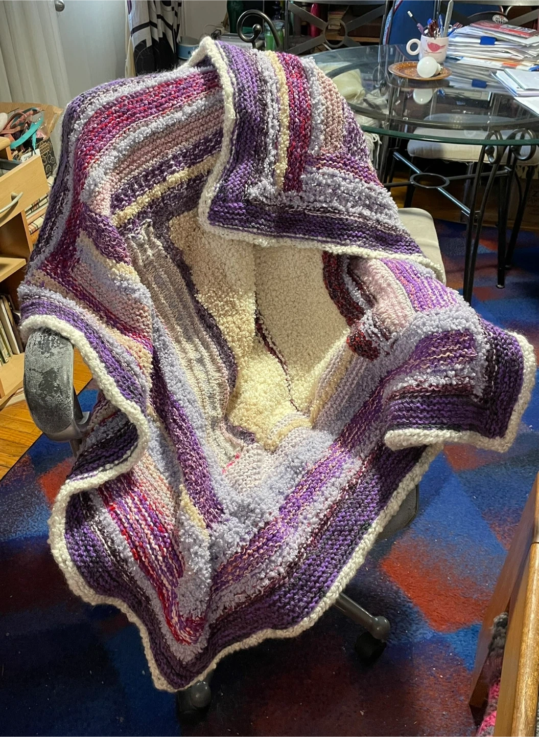 This is a handmade personal blanket, perfect for keeping you cozy. It features a soft texture and a lovely pattern of purples, pinks, and creams. Great for a nap on the couch or adding a touch of warmth to your favourite chair!