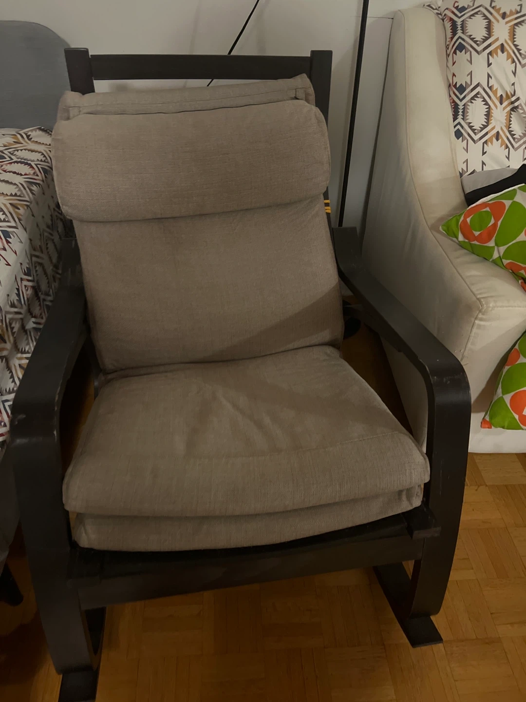 Giving away a comfortable IKEA Poang rocking chair. It features a sturdy brown frame and a cozy beige cushion. Perfect for relaxing after a long day! It is well used and needs fixing … i put a rope on it to make sure it’s safe to use until fixed.