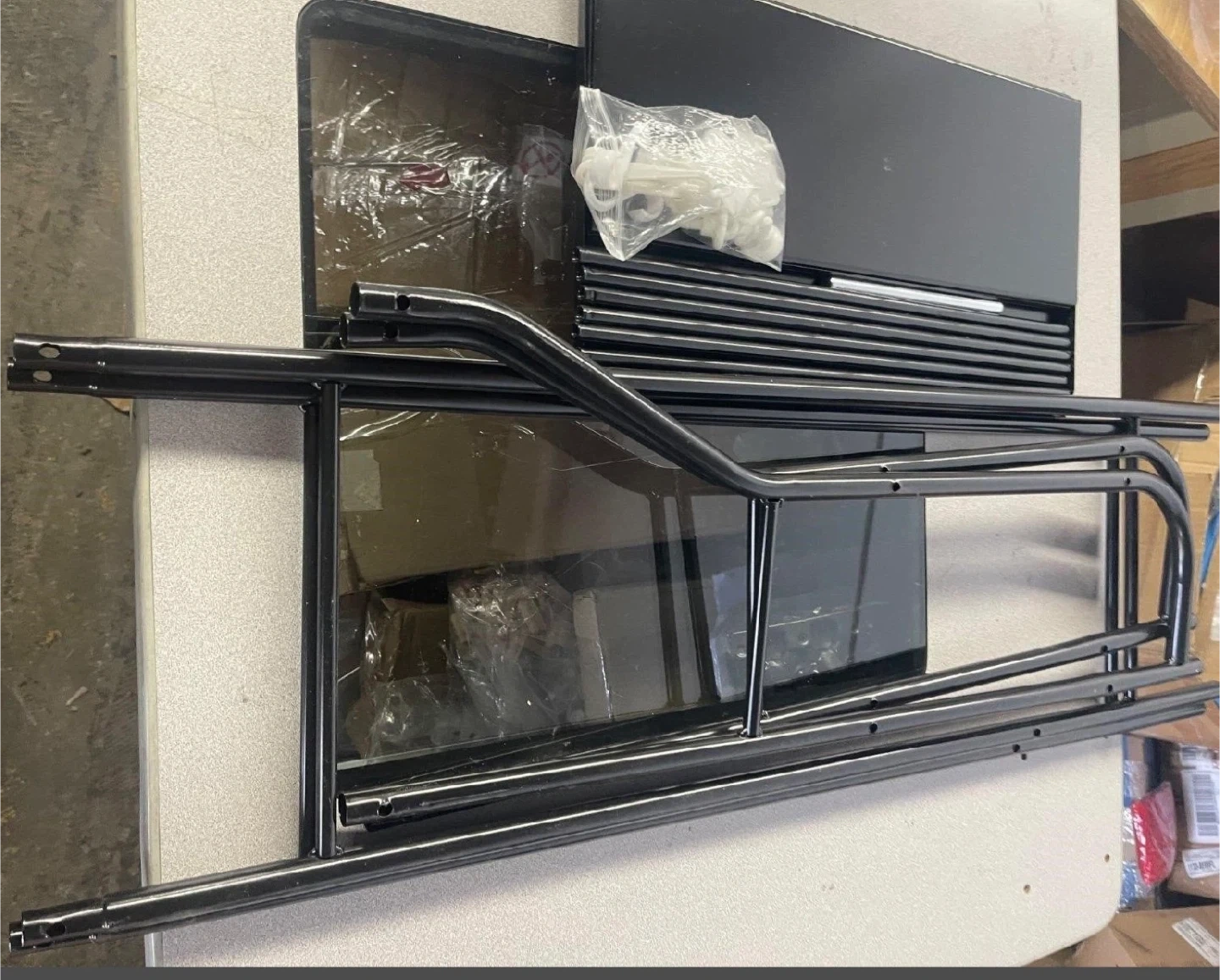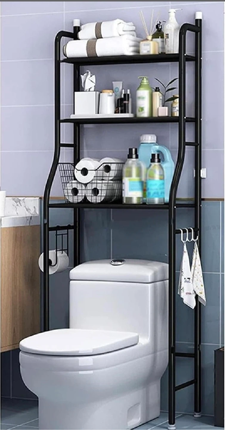 Declutter your bathroom with this new in box over-the-toilet rack, featuring a sleek black finish and durable construction. Maximize your space with its multi-tiered shelving, perfect for storing toiletries and essentials. Measurements are shown in the photos.
