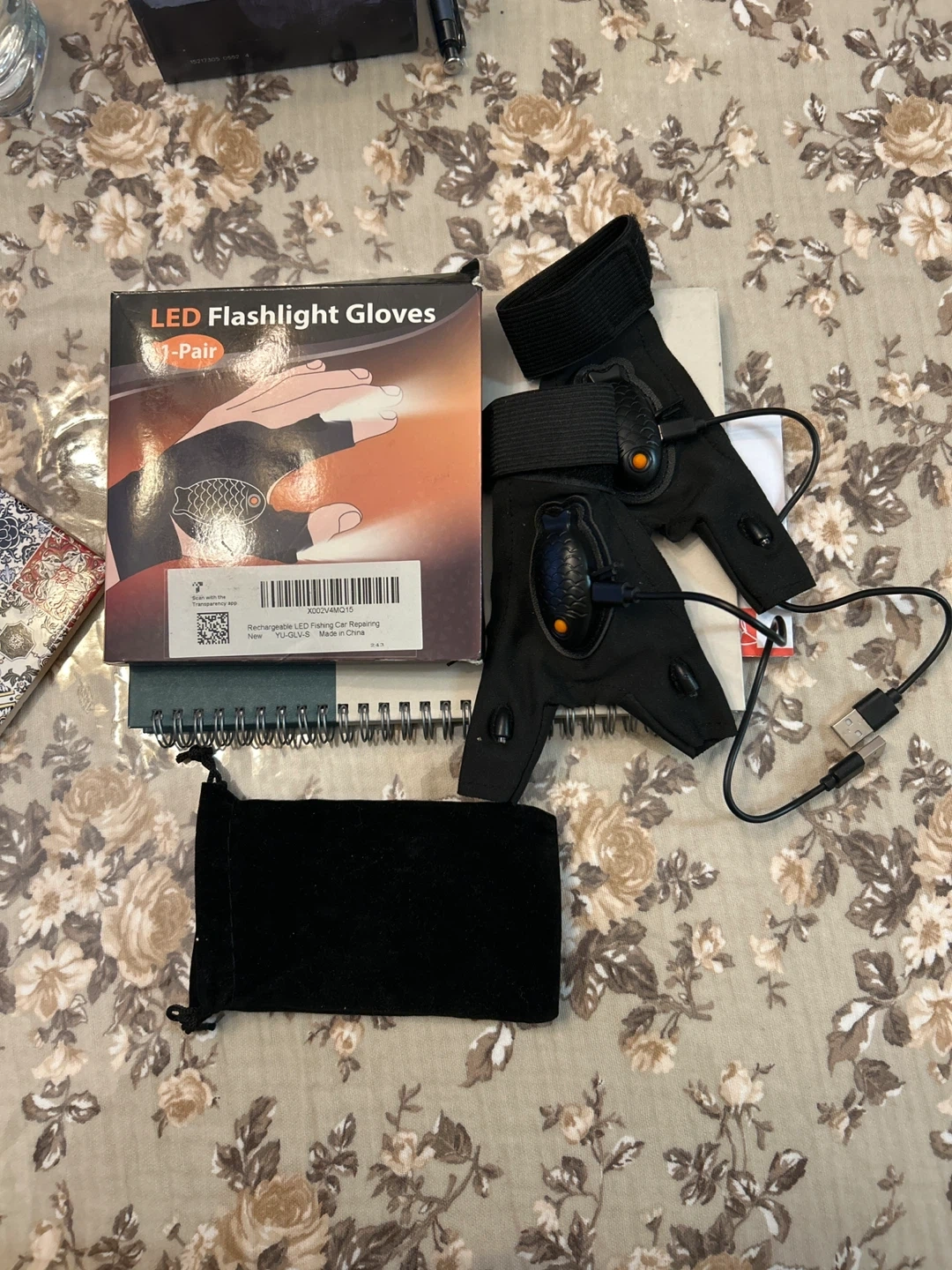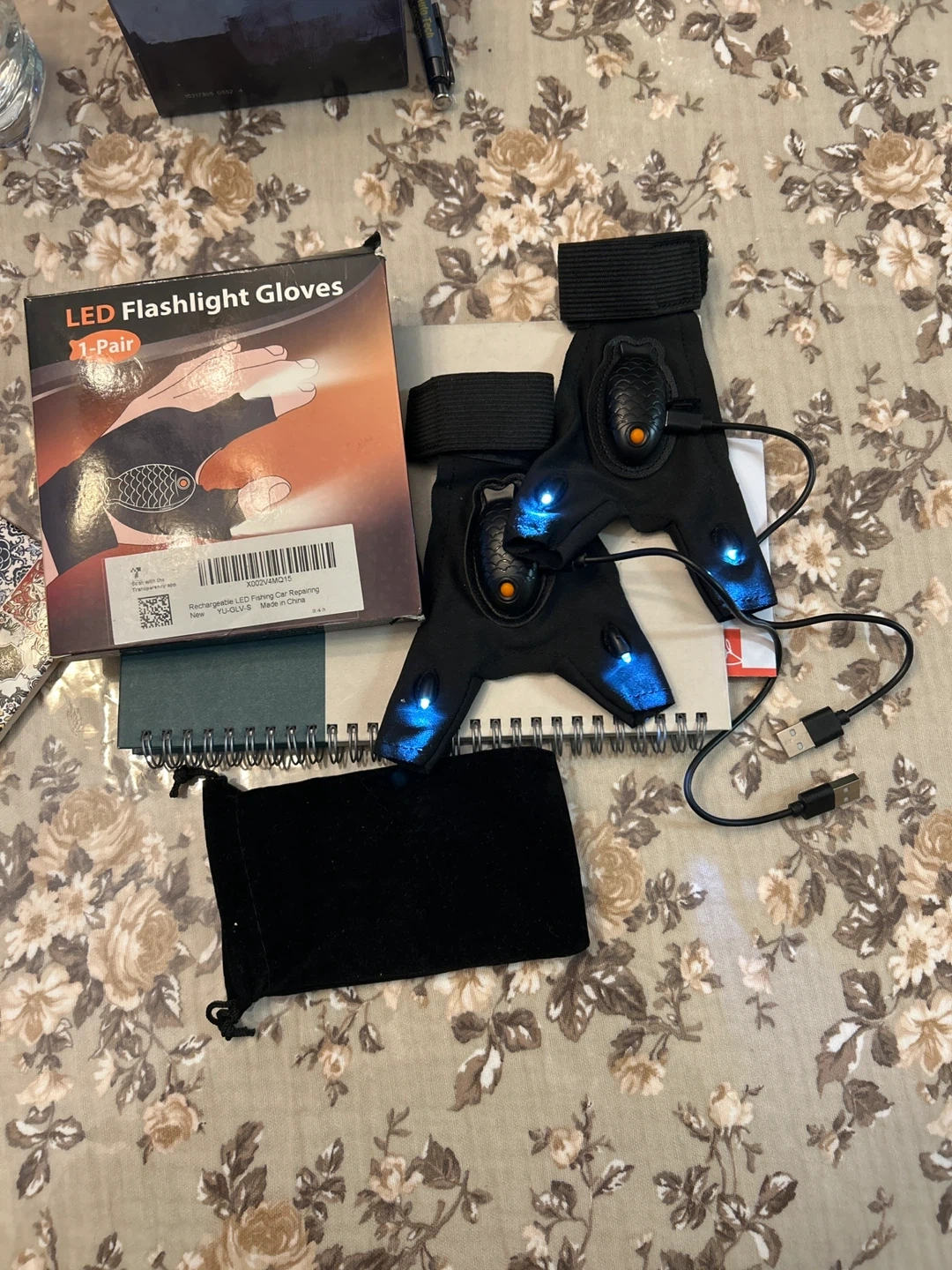 These rechargeable LED flashlight gloves are designed for hands-free lighting. The gloves have adjustable wrist straps for a secure fit. They come with a USB charging cable and a small black pouch. Excellent for working in the dark or for outdoor activities!