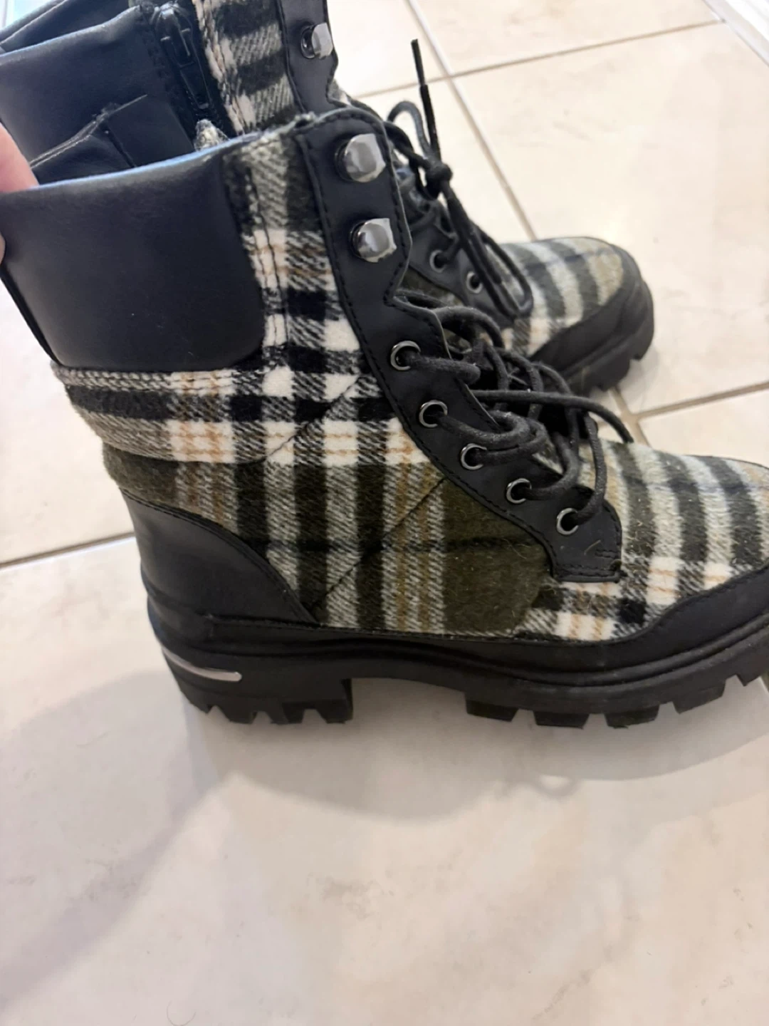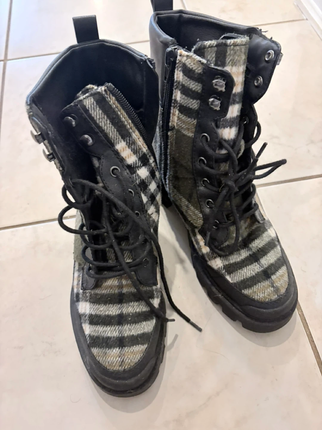 Selling a pair of plaid combat boots in size 8. They're in great condition and ready for a new owner! The boots feature a lace-up design and a sturdy sole, perfect for everyday wear.