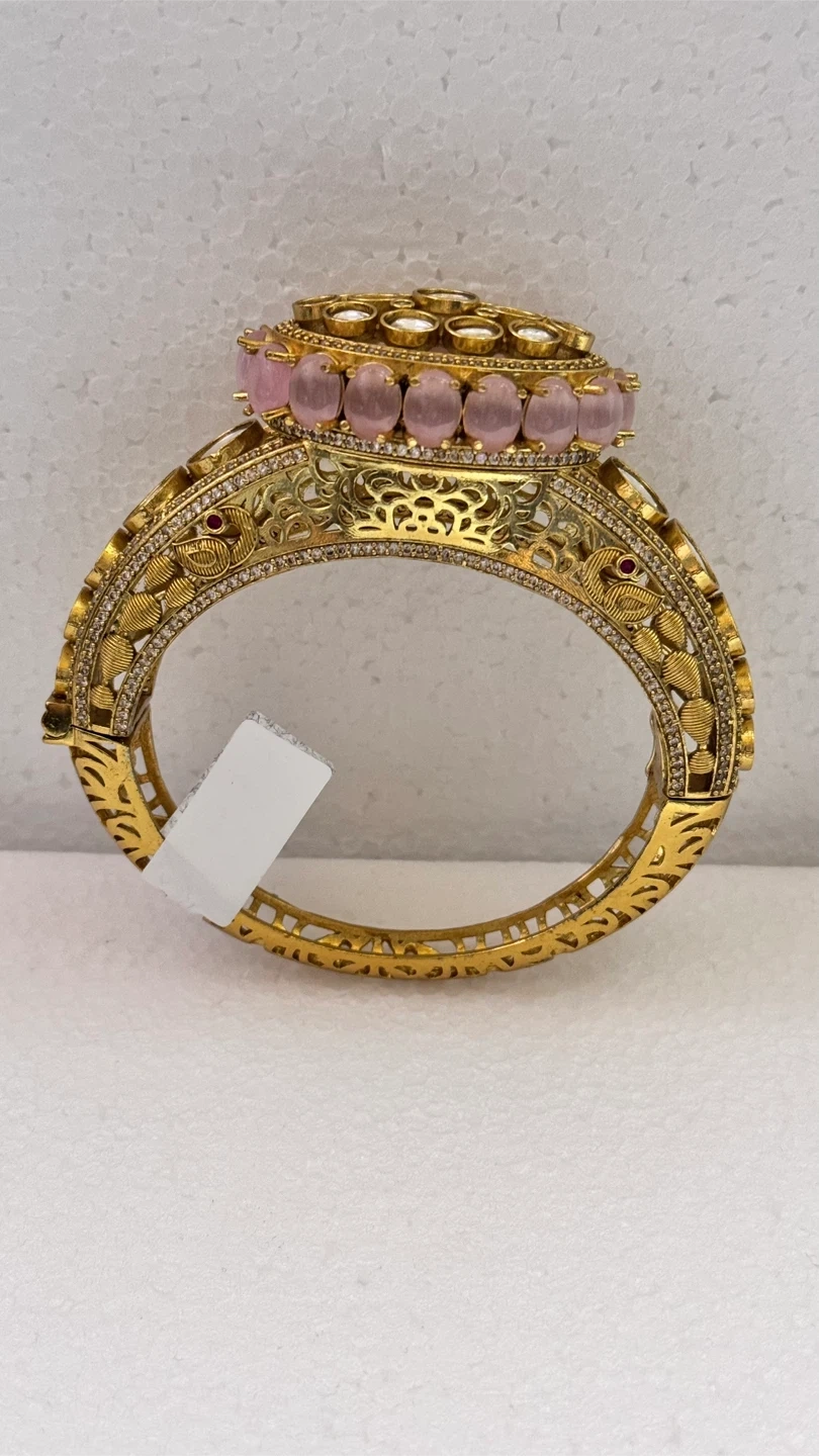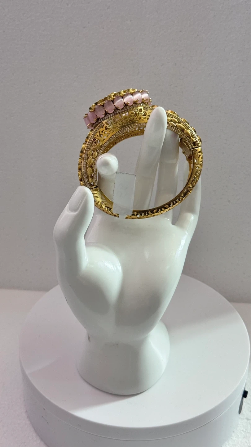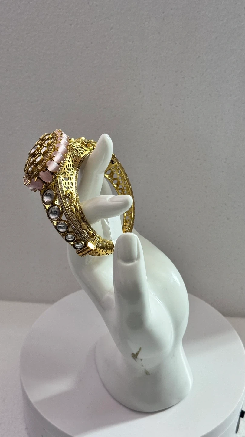 Beautiful gold-toned bangle featuring pink and clear stones. It's in great condition and would be a lovely addition to any outfit!