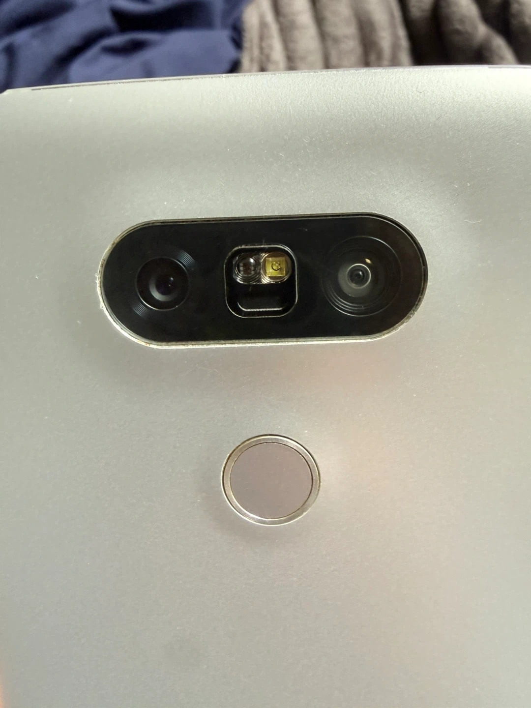 This is an LG G5 smartphone in silver. It features a dual rear camera setup and a fingerprint sensor on the back. The USB-C port is located on the bottom edge.
