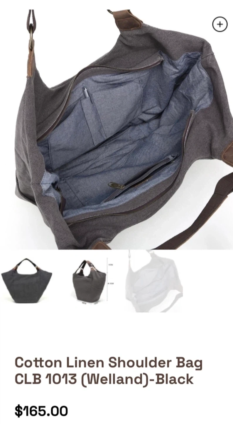 This is a dark gray cotton linen/leather large shoulder bag. It has dimensions of 45.5cm height, 28cm width, and 18cm depth.