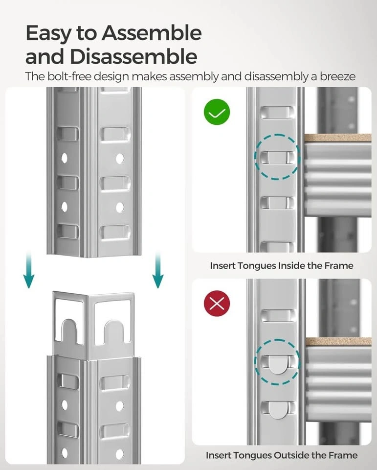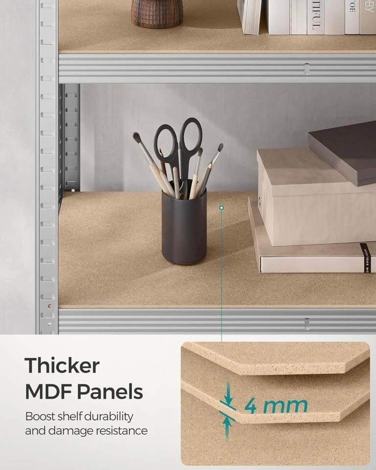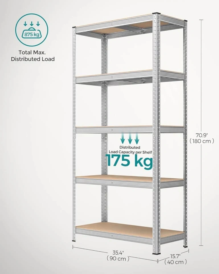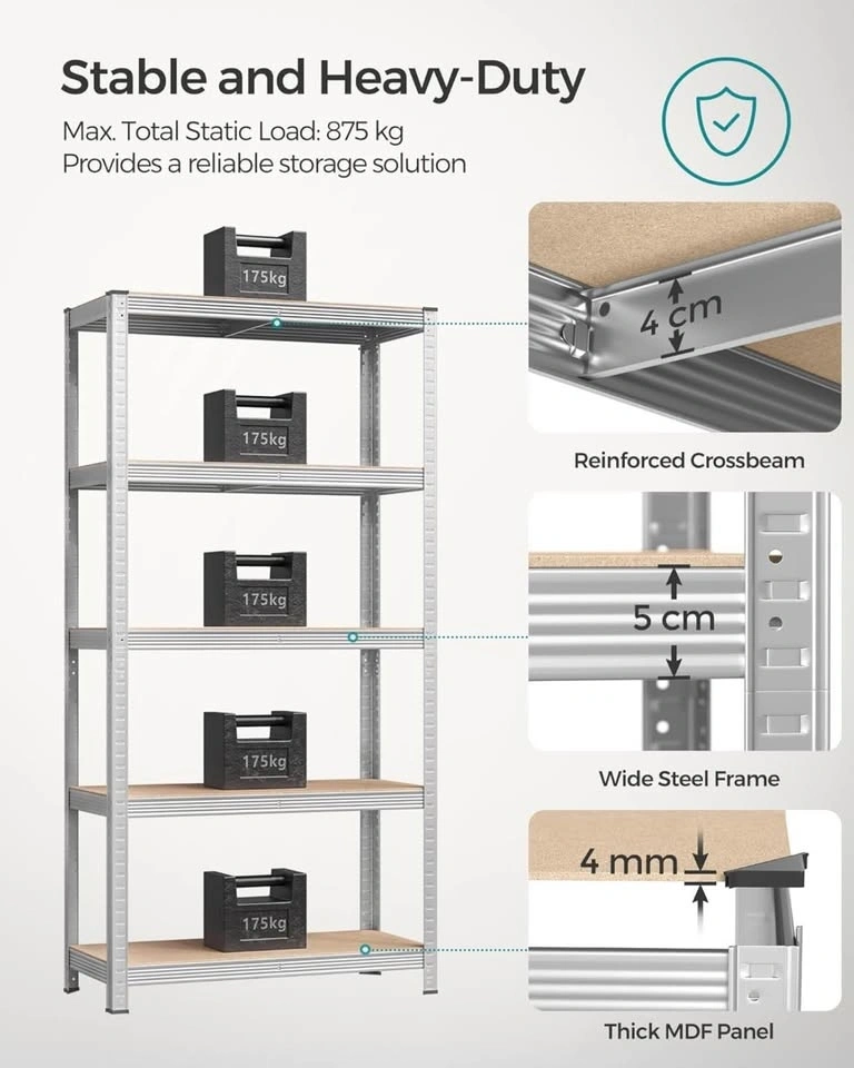 This new 5-tier heavy-duty steel shelving unit, model UGLR040E02, offers robust storage. The unit measures 180 cm in height, 90 cm in width, and 40 cm in depth, making it ideal for organizing your garage, basement, or workshop. Featuring a bolt-free design, it's easy to assemble and disassemble, with thick MDF panels for enhanced durability and damage resistance. The reinforced crossbeam and wide steel frame provide a stable and heavy-duty storage solution.