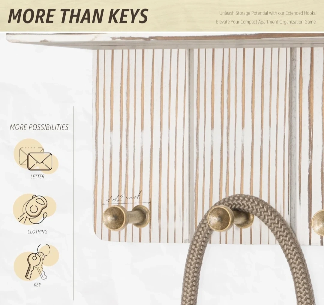 This wall mount key holder features a rustic white wood design with a small shelf for letters or decor. It comes with 4 sturdy hooks for keys, mail, or lightweight accessories. Perfect for entryway organization!