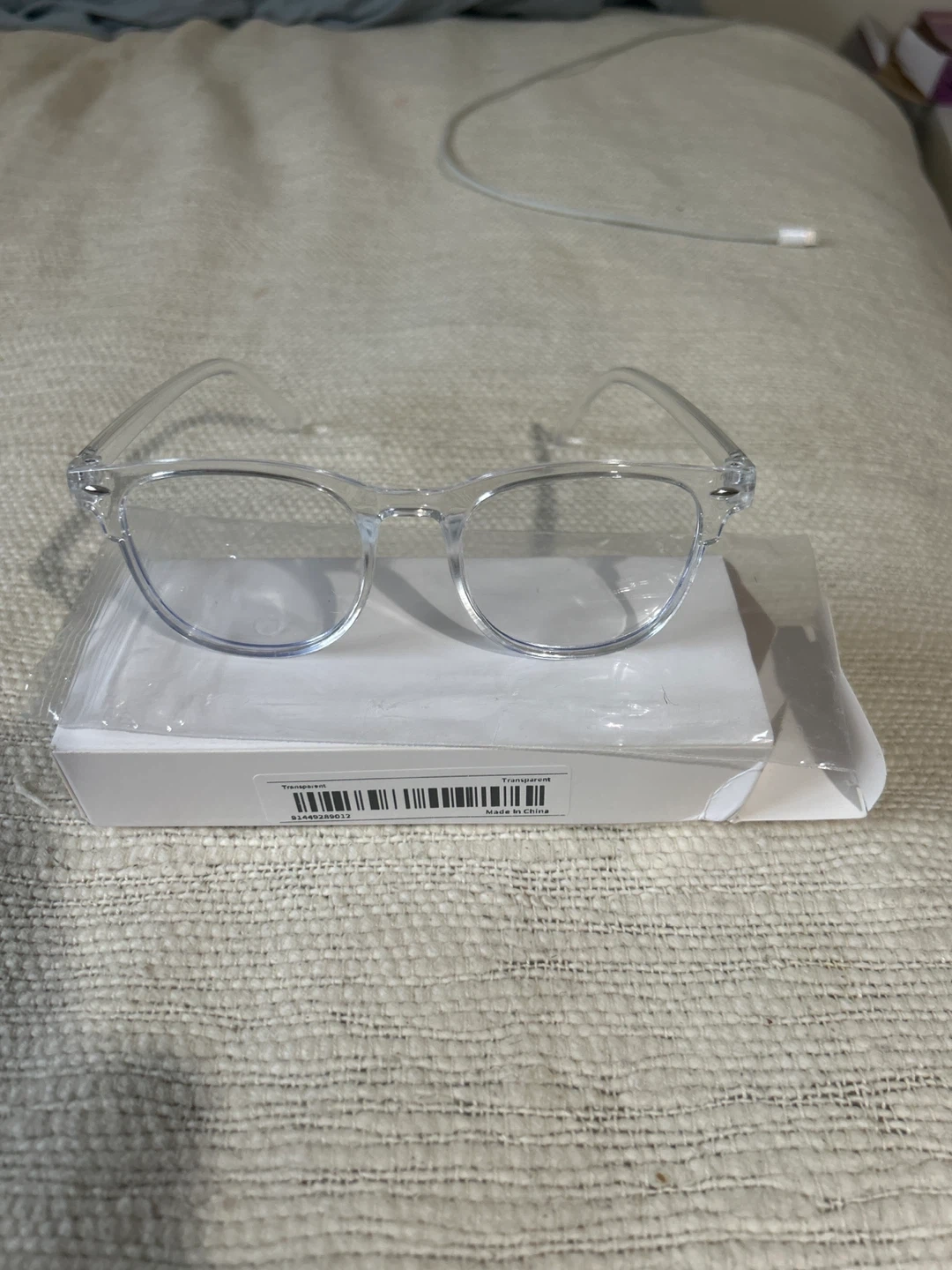 These are clear frame blue light blocking glasses. They come in a box and are sealed in plastic. These glasses help reduce eye strain from screens.