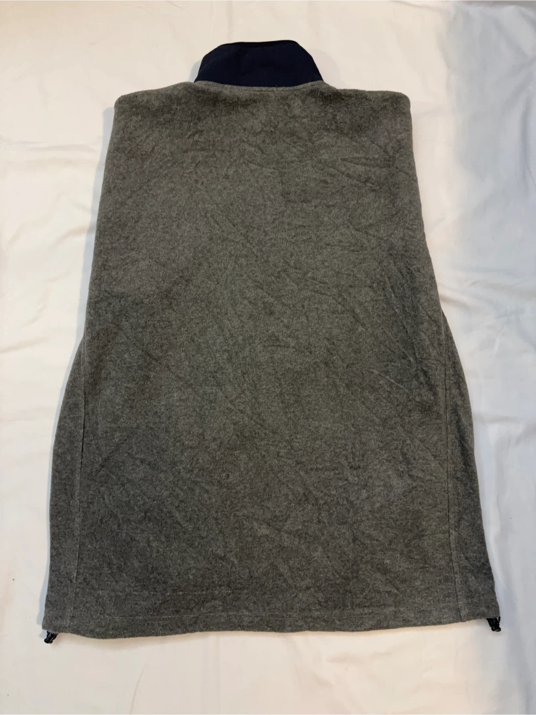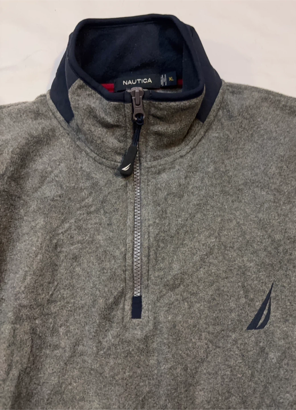 Lightweight Nautica pullover. Quarter-zip neckline with zipper pull. Navy sail logo on chest. Subtle navy trim at cuffs and collar. Versatile casual layer. $20 cash, porch pick up Kennedy and Eglinton.