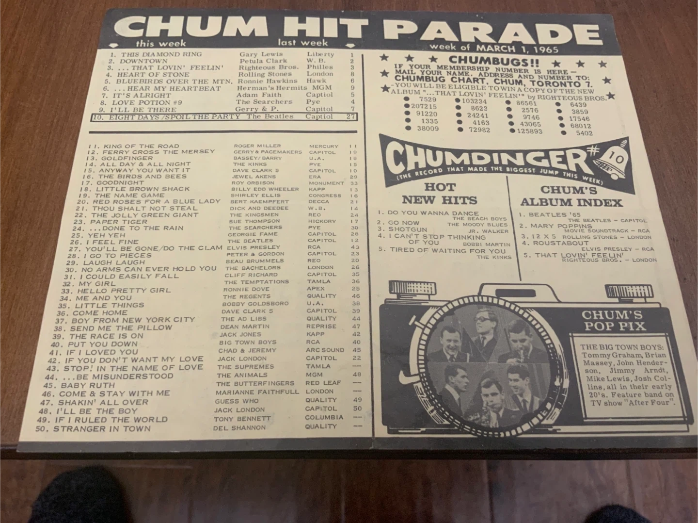This flyer details the 'Name Game' contest rules from CHUM Radio Toronto. It also includes the CHUM Hit Parade chart from the week of March 1, 1965. A 'get fresh-start' ad by Pond's is at the bottom.