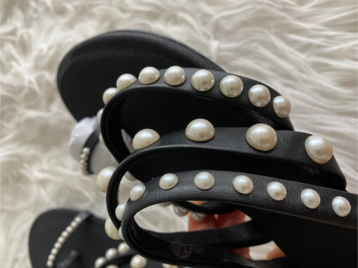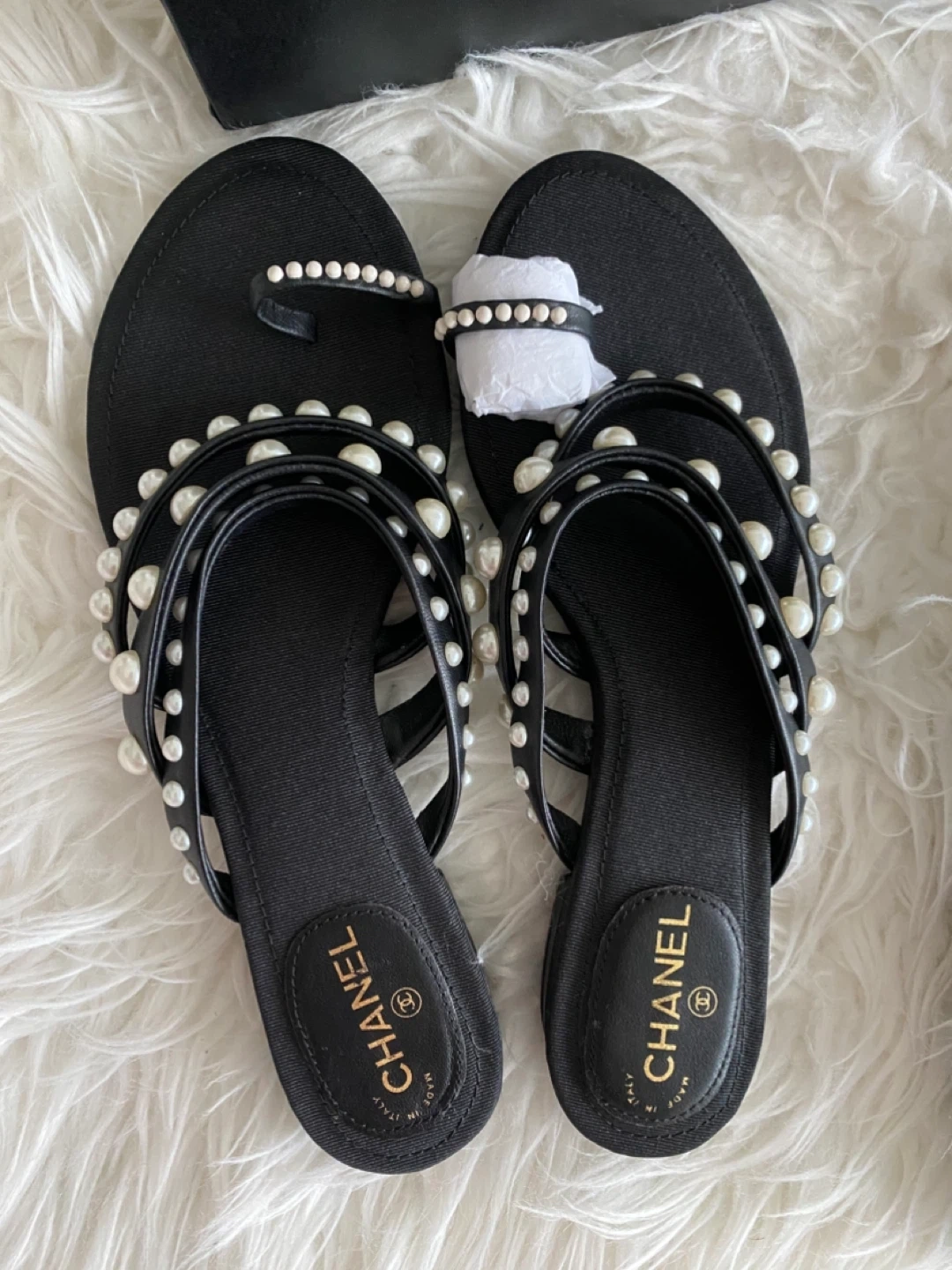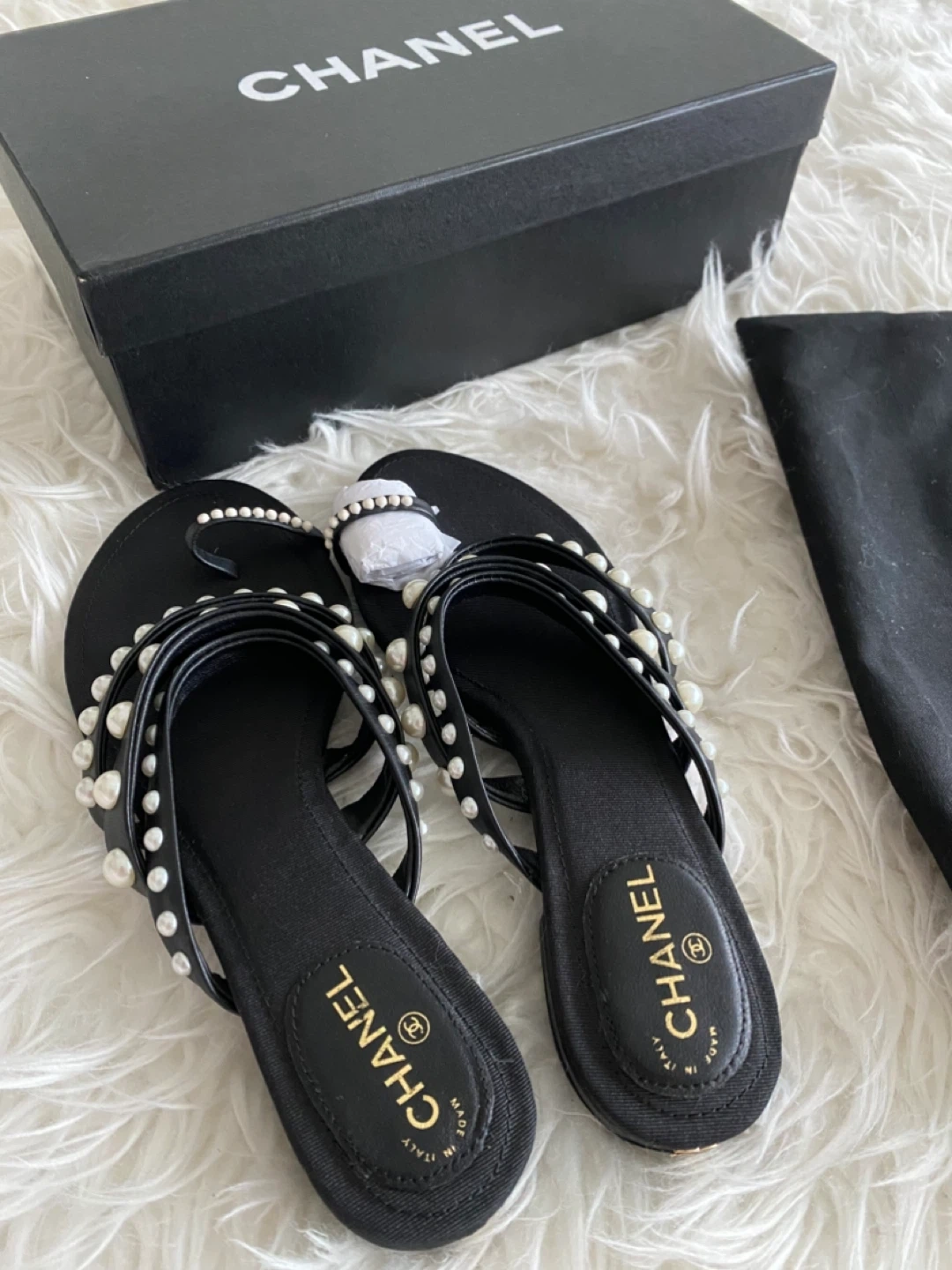 Chanel black thong sandals embellished with pearls. Made in Italy. Includes original box and dust bag.