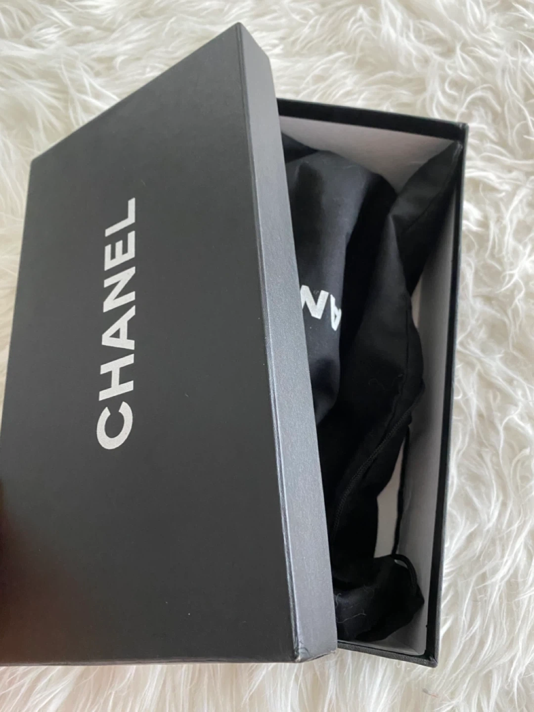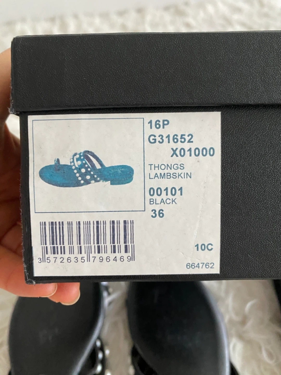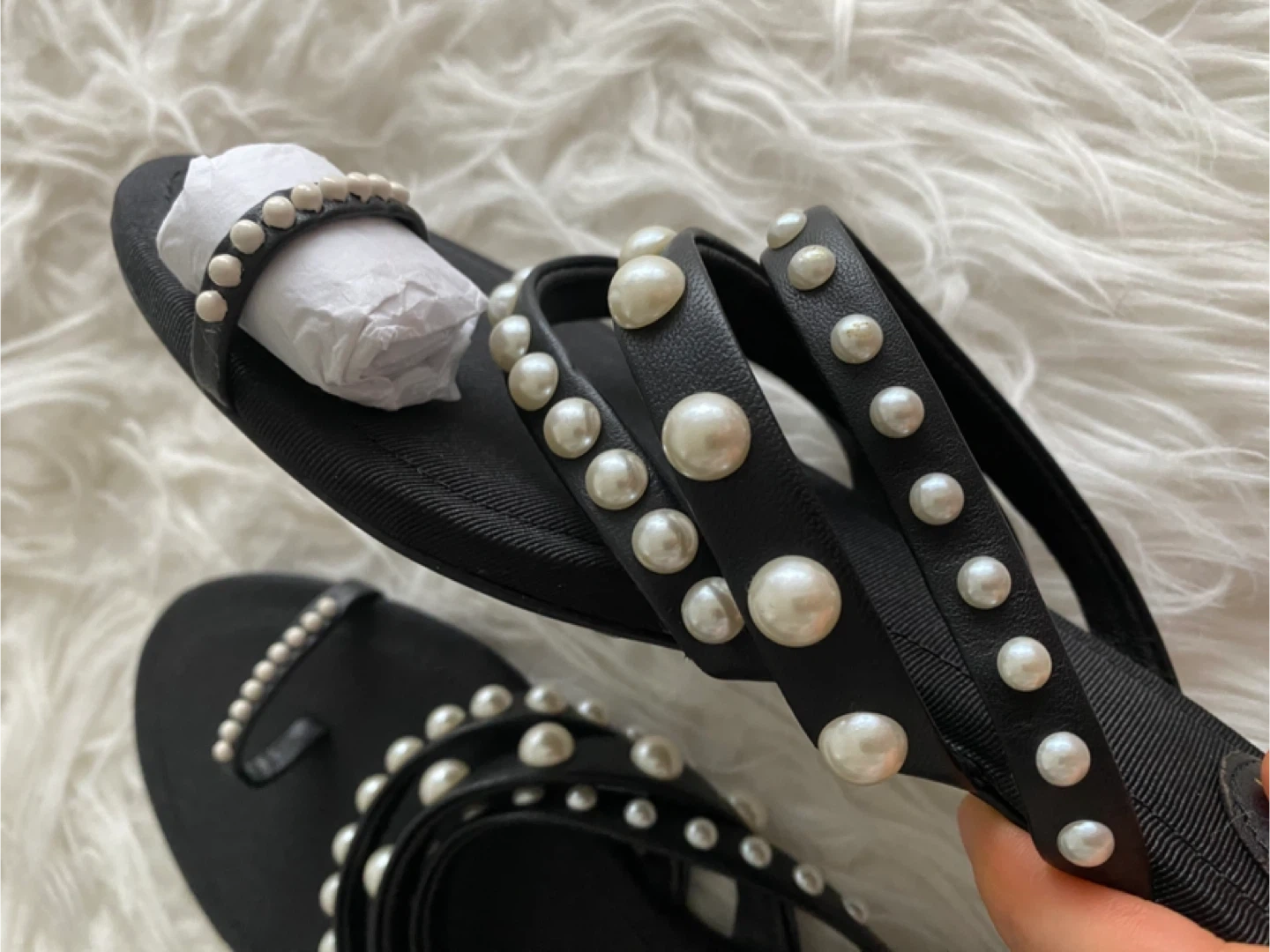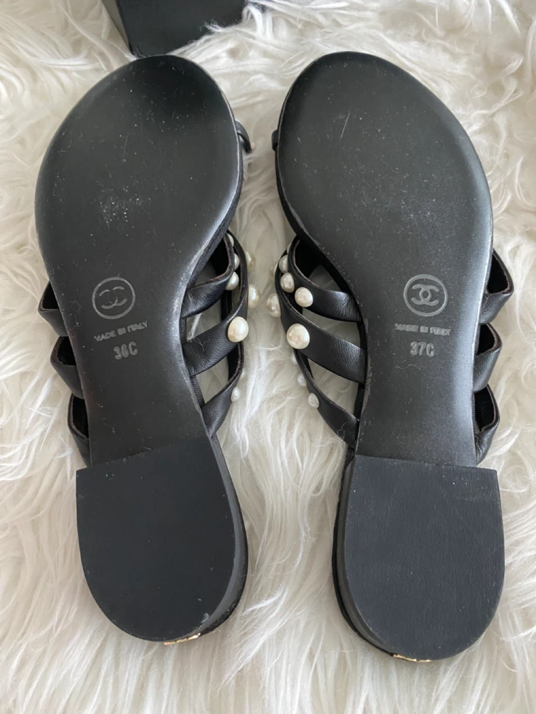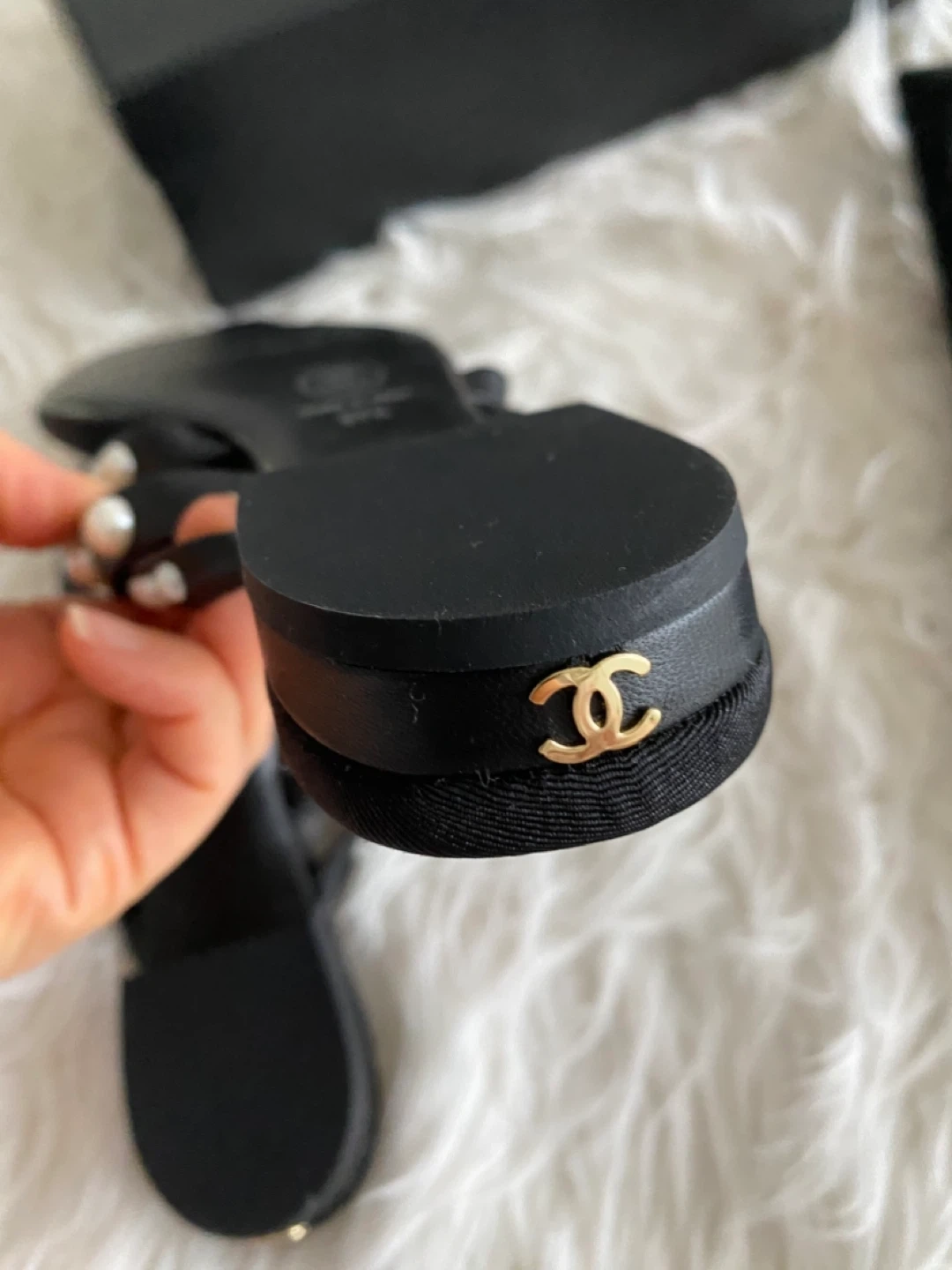 Chanel black thong sandals embellished with pearls. Made in Italy. Includes original box and dust bag.