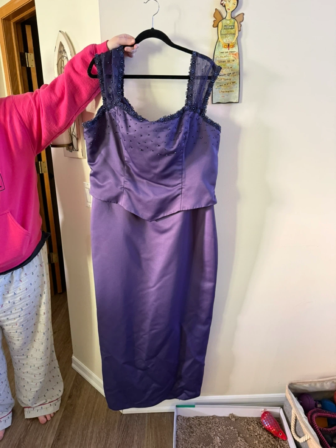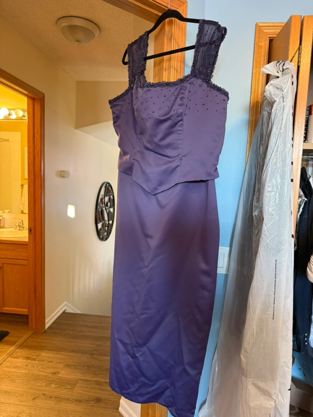 Perfect for mother of the bride or groom. This elegant amethyst formal dress features delicate beading on the straps and neckline. It has a satin finish and a flattering silhouette. Size shows 26, I was about 220lbs at 5’3” in this gown. Worn once, in like new condition.