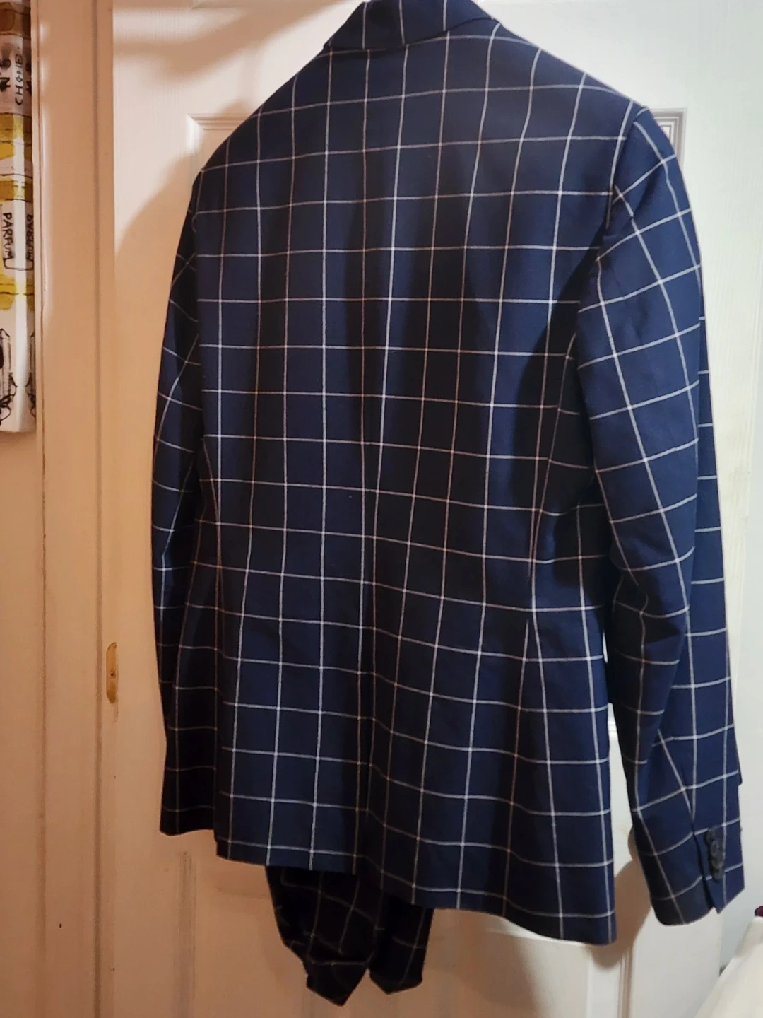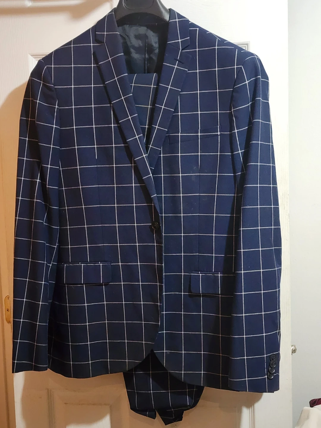 This Topman suit features a stylish blue and white grid pattern, perfect for making a statement. It is in used condition, ideal for any occasion that calls for a smart, fashionable look.