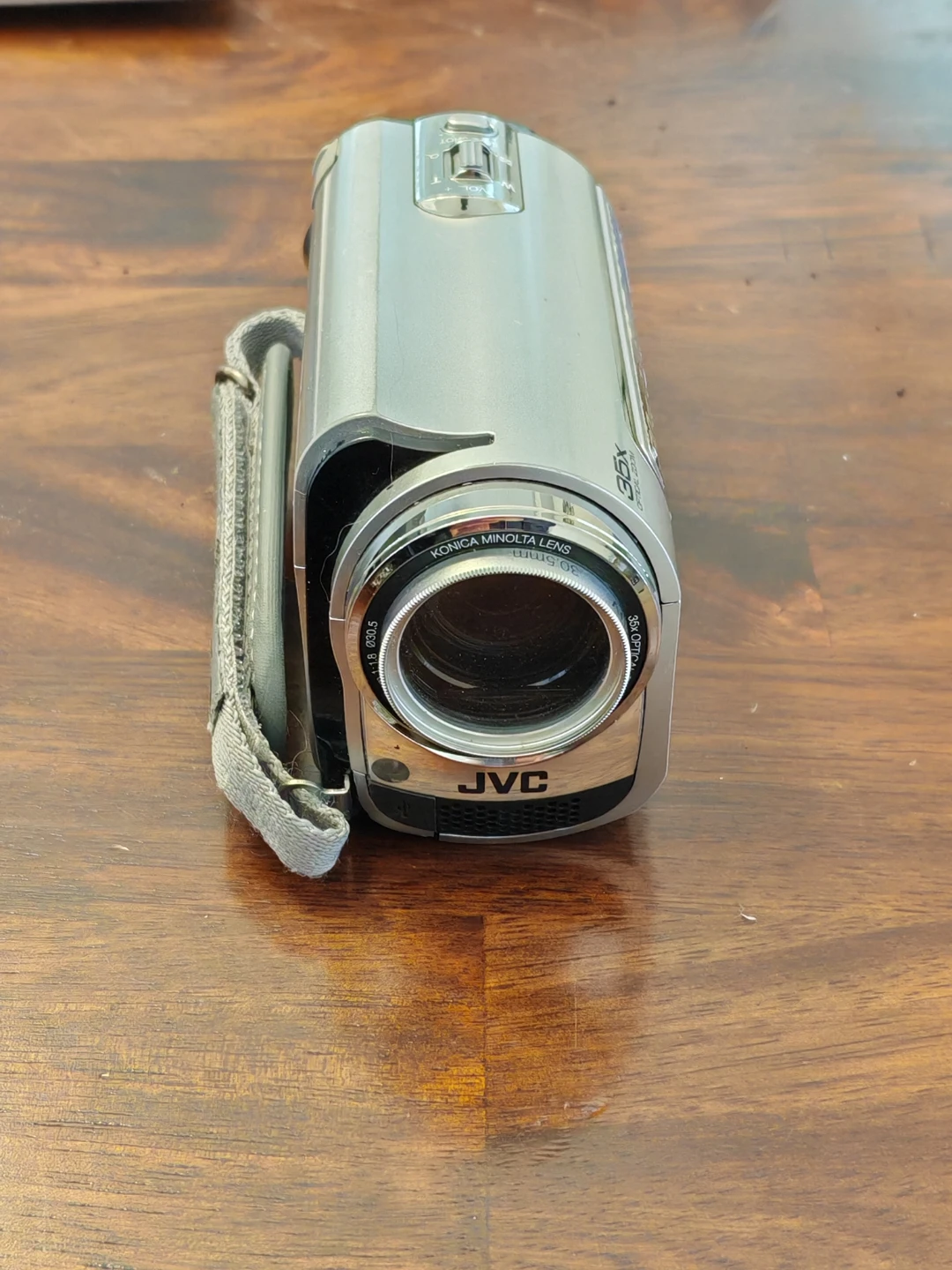 This JVC Everio camcorder has a 30GB hard disk drive and 35x optical zoom. It works normally, in good condition. It comes with a charger, a battery and a Kenko UV filter.