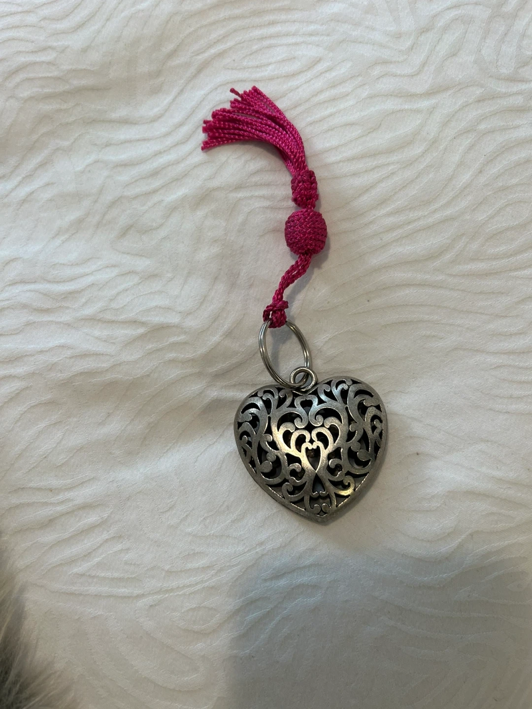 Cute silver heart charm with a decorative openwork design and a fun pink tassel! It's in great condition and ready to add some flair to your keys, bag, or wherever you'd like to clip it