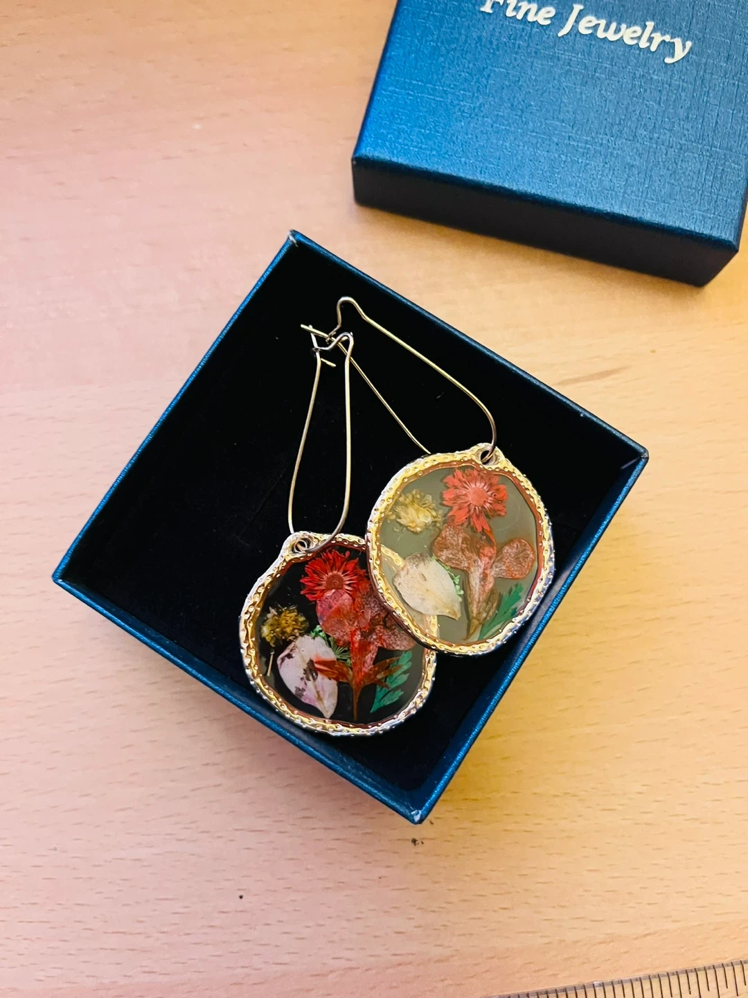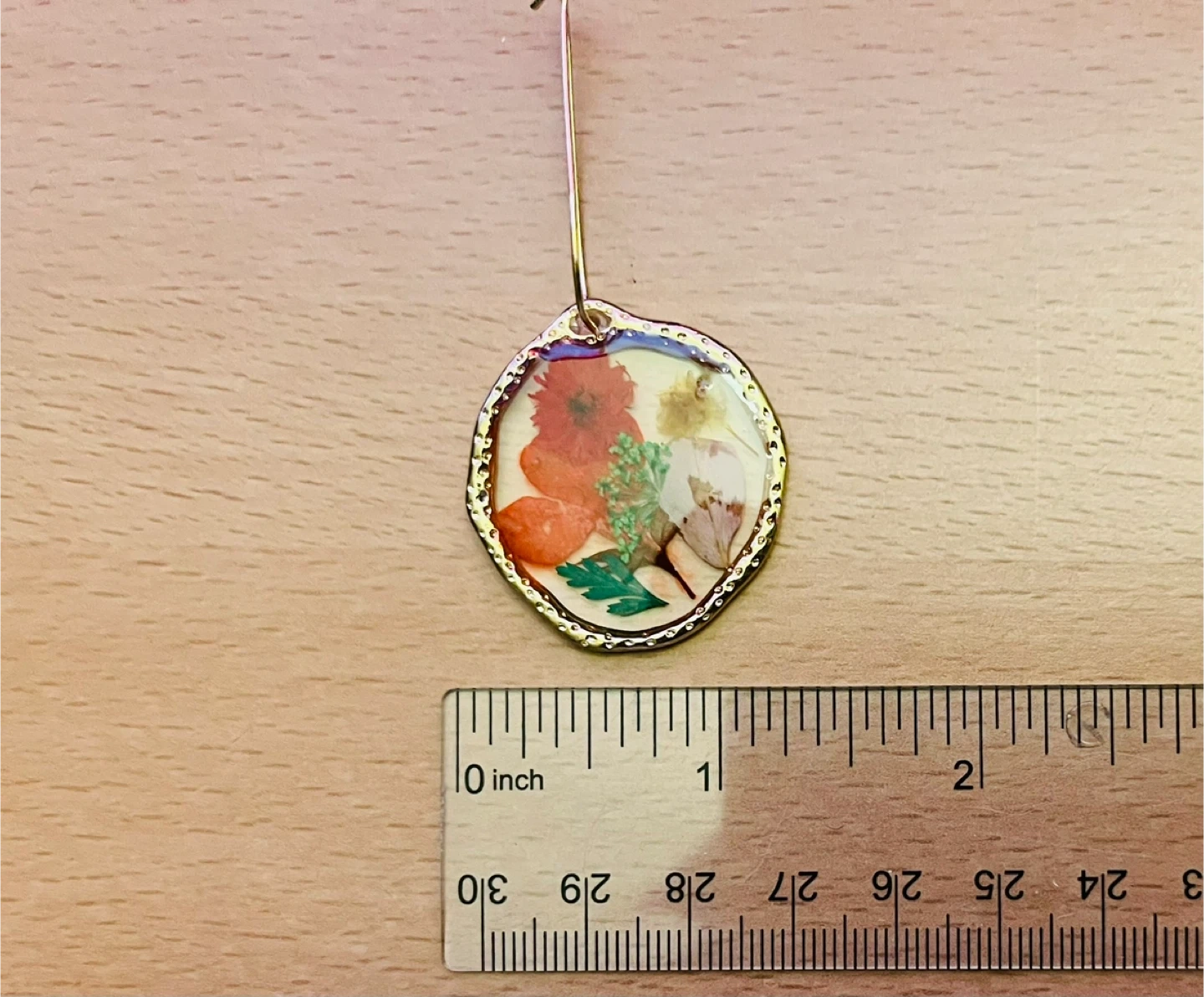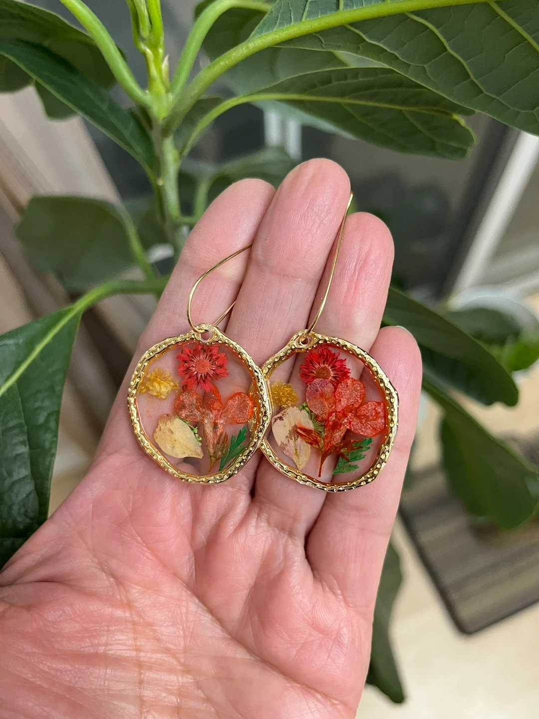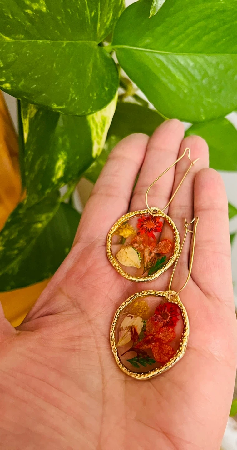 These beautiful hoop earrings showcase real dried flowers encased in clear resin. The gold-tone hoops add a touch of elegance. The earring pendants measure approximately 1.5 inches in diameter.