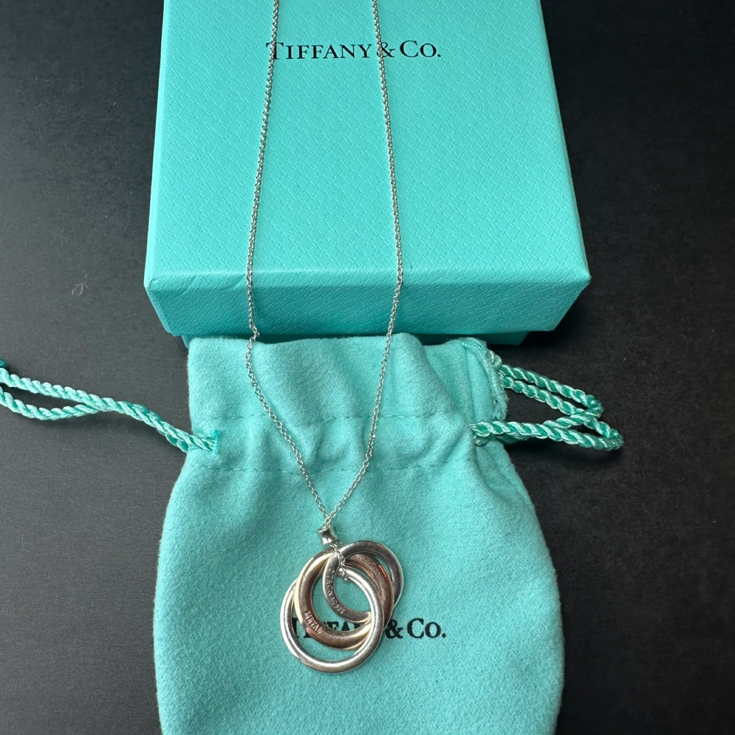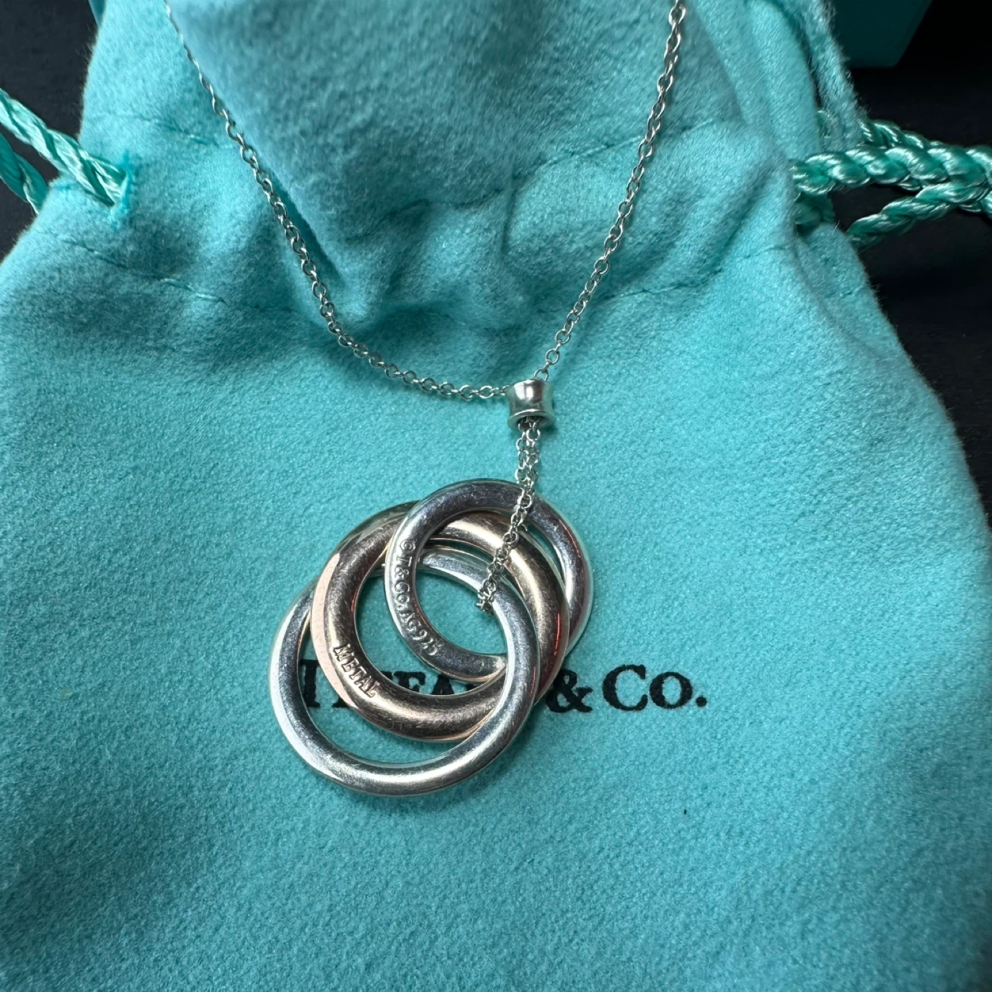 Tiffany & Co. sterling silver necklace featuring the iconic three interlocking rings design. Classic, minimal, and timeless.