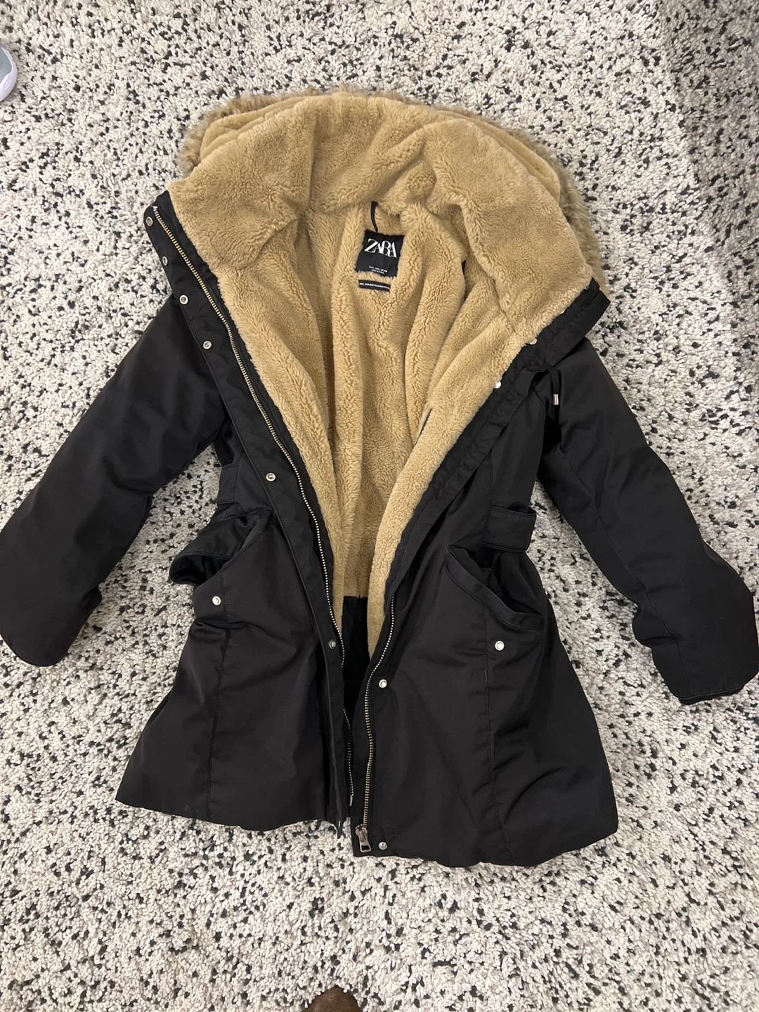 Selling a Zara winter parka in black! It's in great condition and perfect for the cold weather. The parka features a faux fur-lined hood, inside pocket, interior and exterior adjustable waist band.
