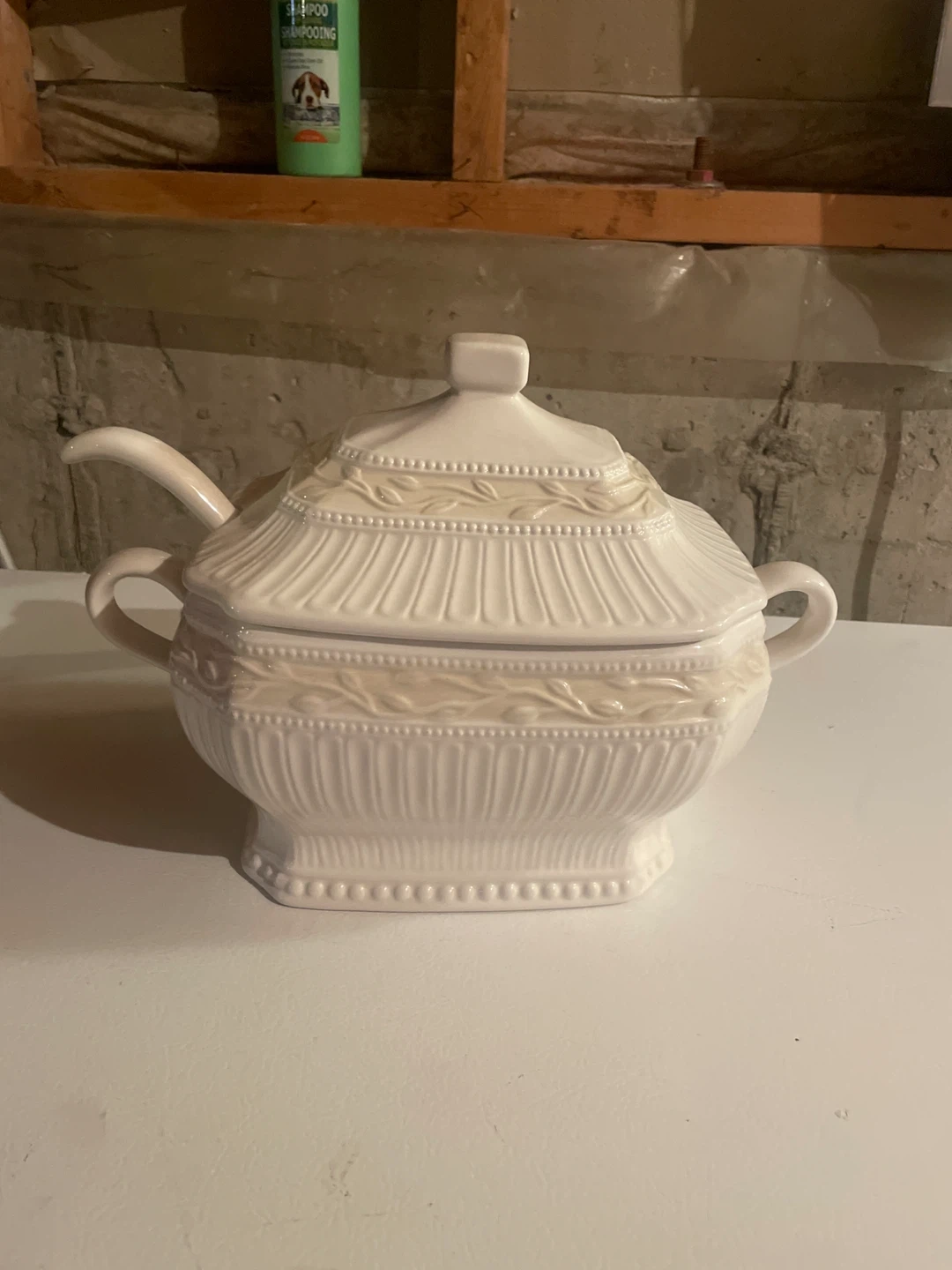 This is a white ceramic soup tureen with a matching ladle. It features elegant embossed detailing around the rim and lid. Its classic design makes it suitable for serving soups or stews at your next dinner party.