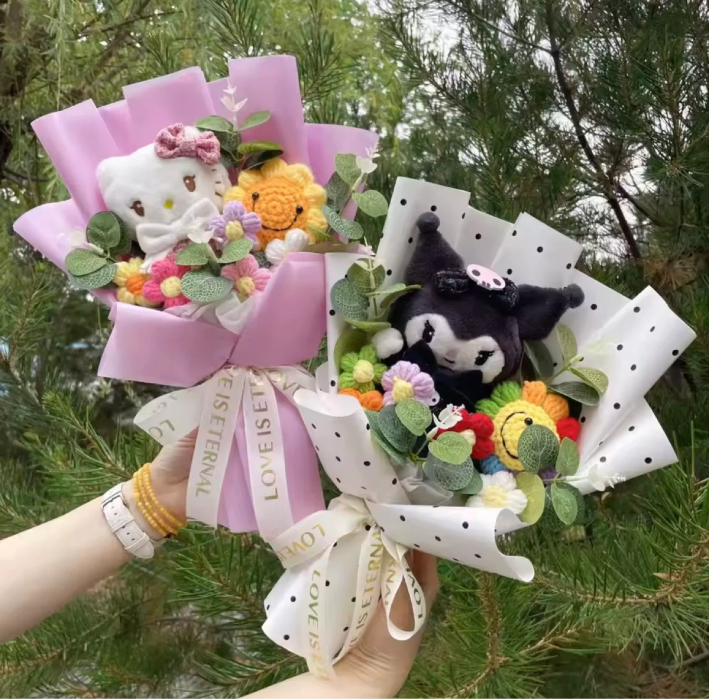 These adorable plush bouquets feature popular characters like Hello Kitty and a bear. They're wrapped in decorative paper with ribbon accents. Makes a sweet surprise!
