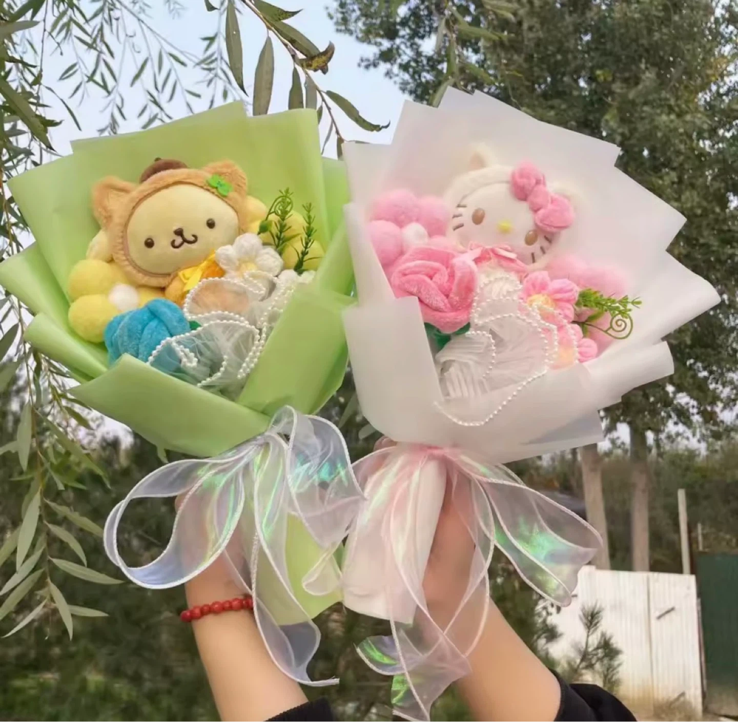 These adorable plush bouquets feature popular characters like Hello Kitty and a bear. They're wrapped in decorative paper with ribbon accents. Makes a sweet surprise!