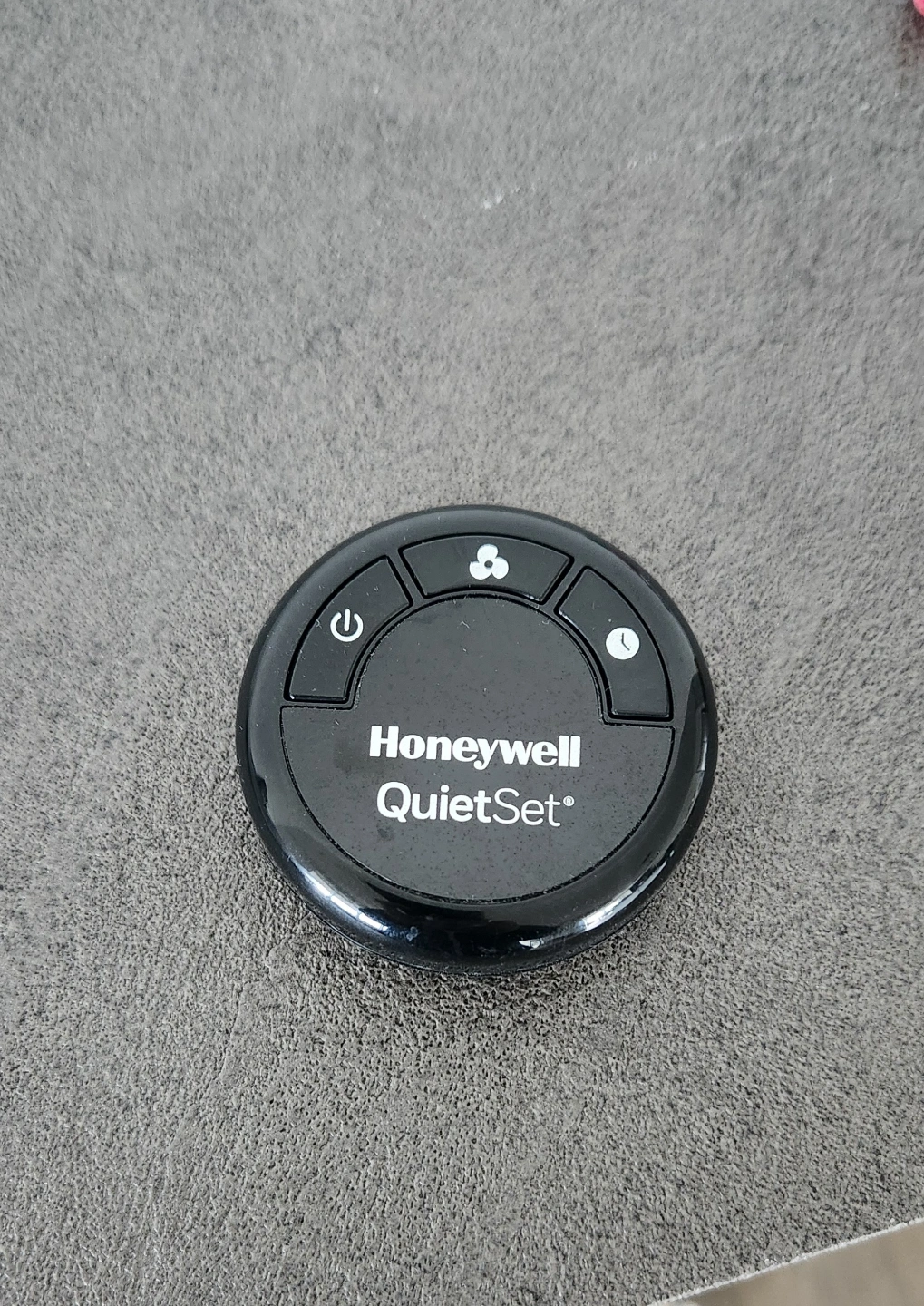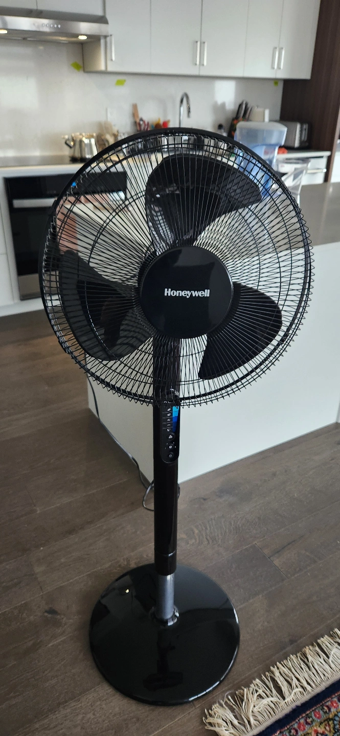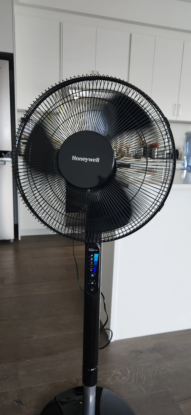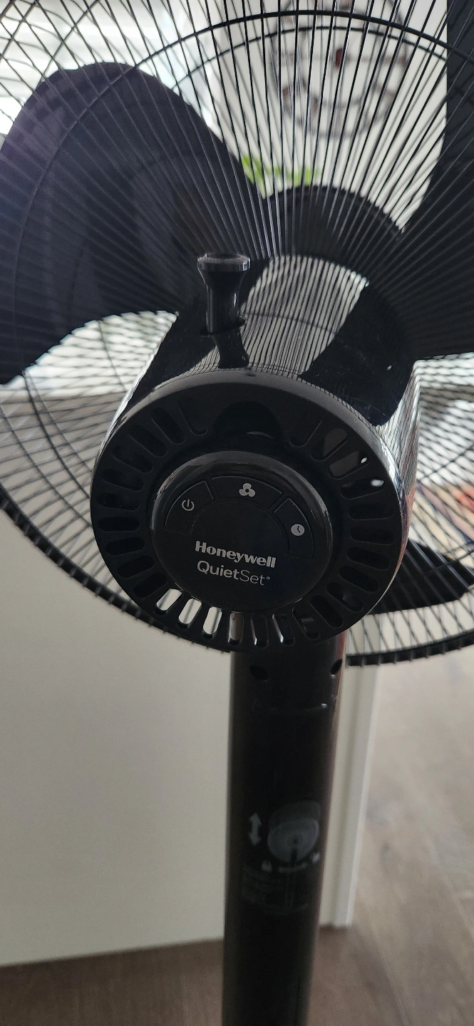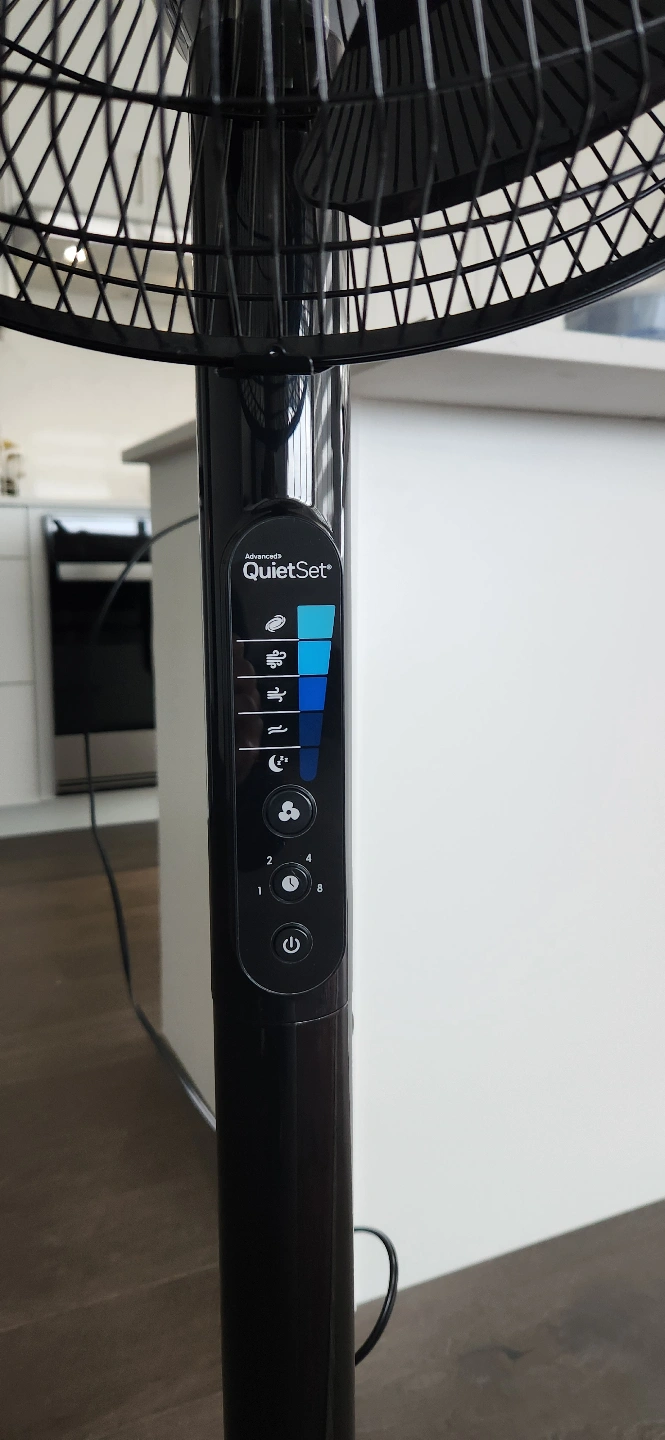 Black stand fan, QuietSet technology. Multiple speed settings and timer function. Includes remote control. Oscillating blades.