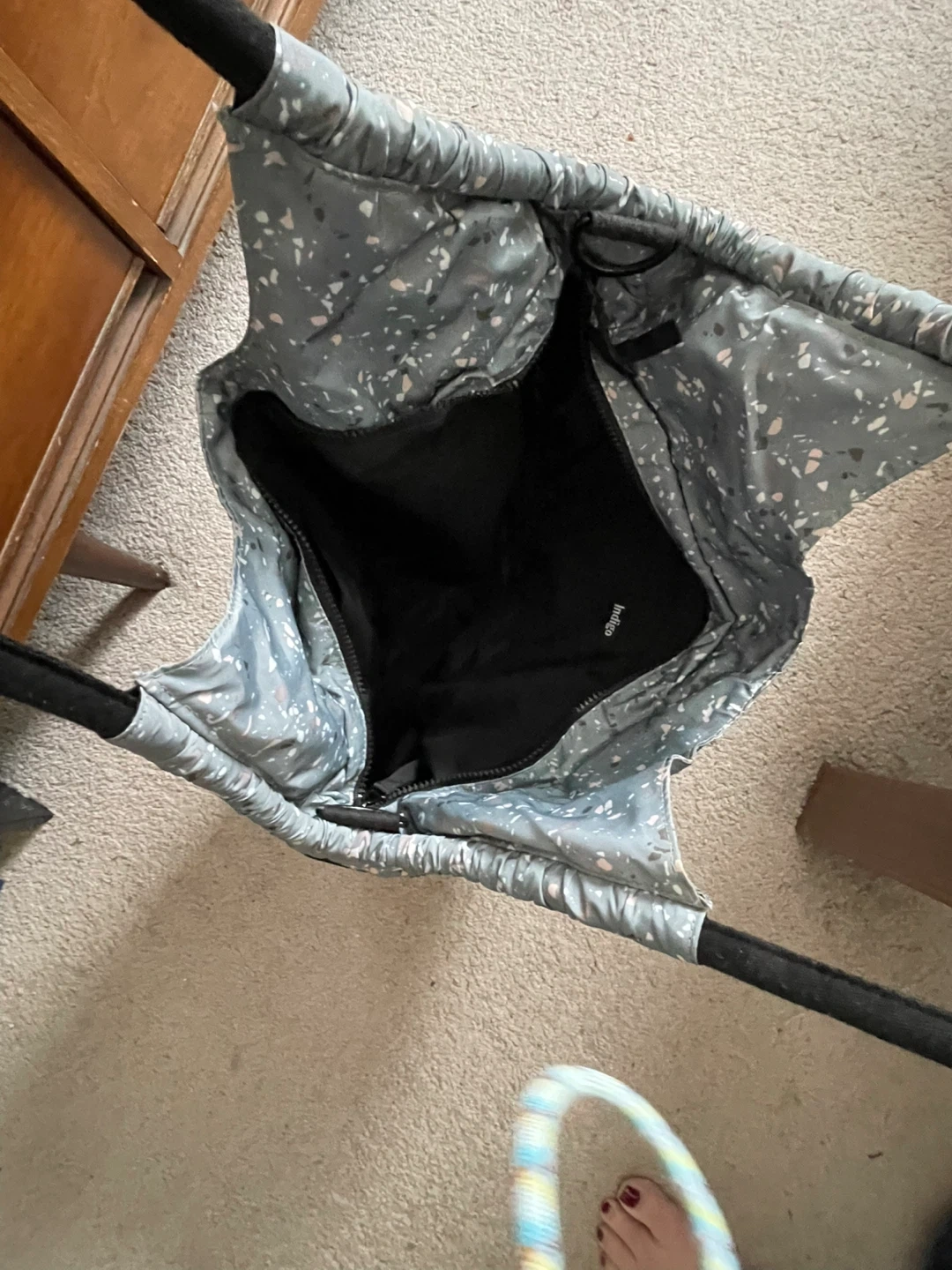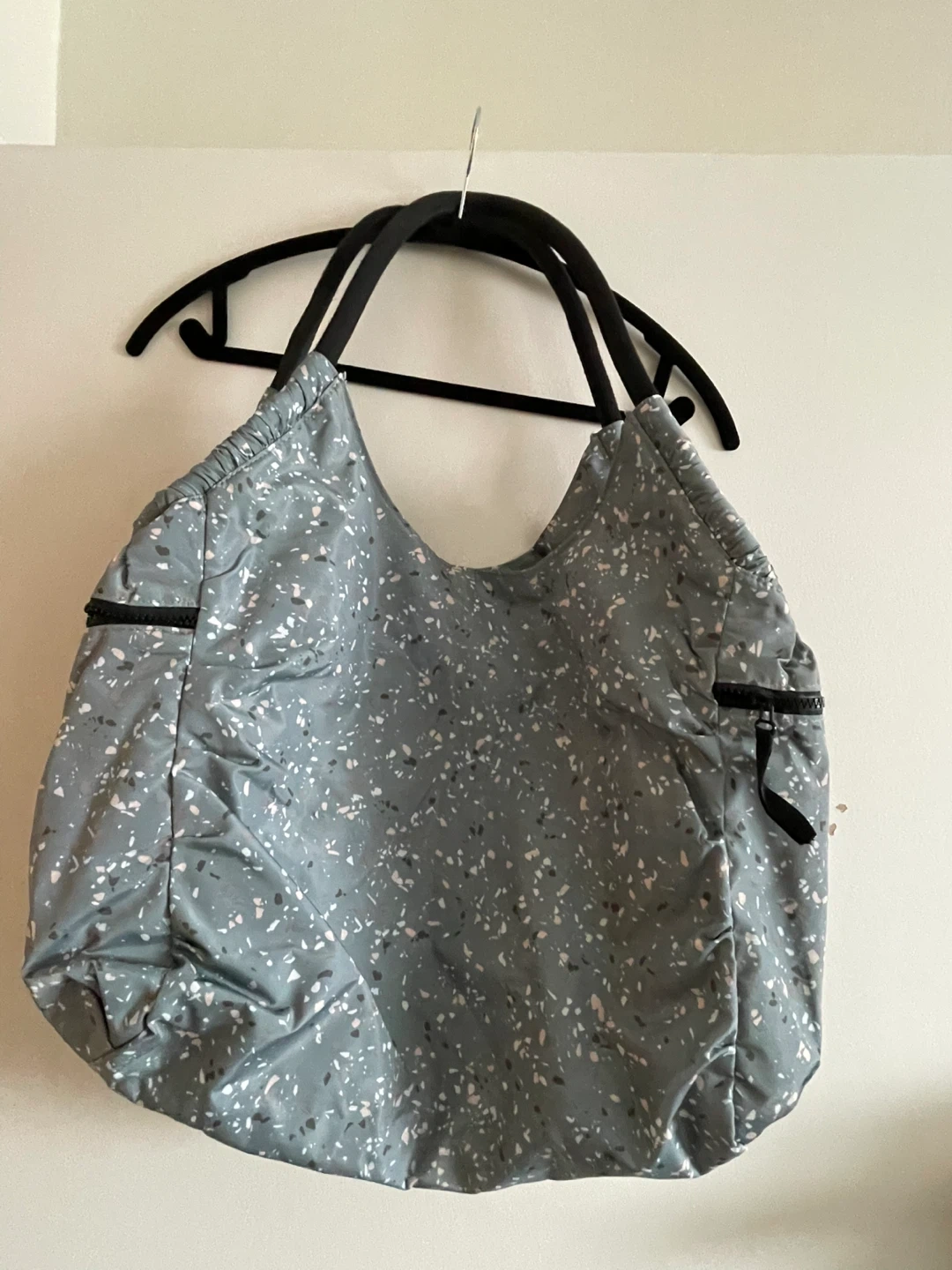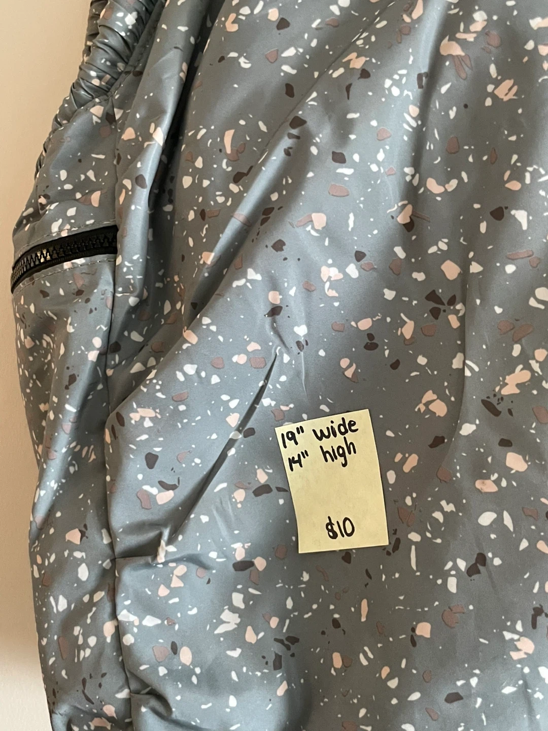 This Baggallini tote bag has a terrazzo-style print. It's 19 inches wide and 14 inches high. It features a zippered main compartment and two exterior zippered pockets.