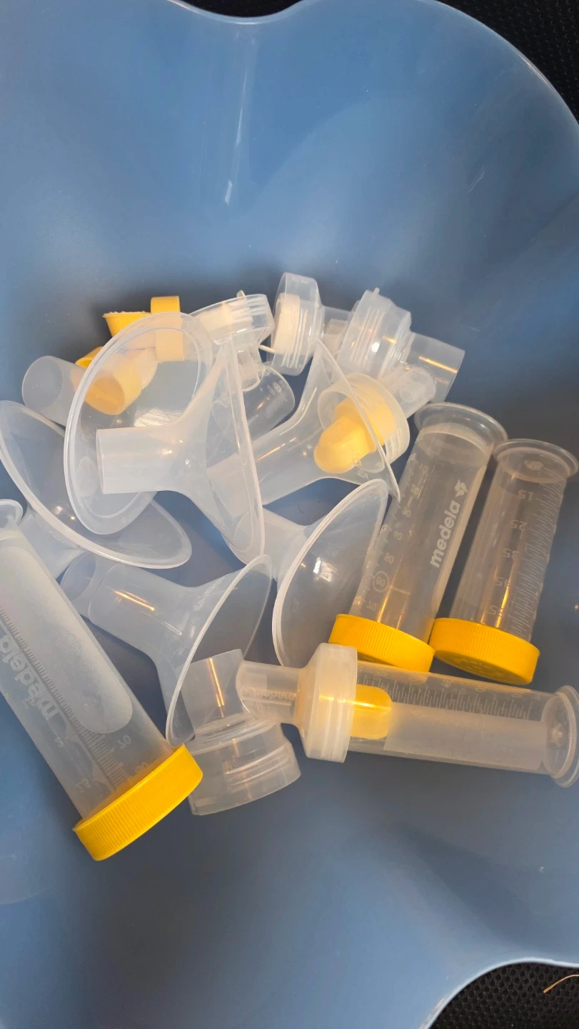 Medela Breast Pump Parts Collection and Tupperware bowl