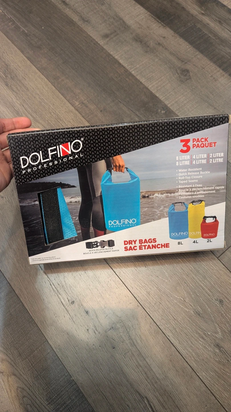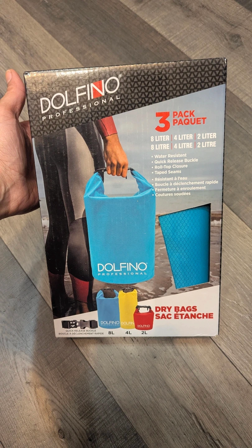 New Dolfino Professional dry bags! This is a 3-pack with different sizes: 8 liter, 4 liter, and 2 liter. Super handy for keeping your stuff dry. Has water resistant material, quick release buckle, roll-top closure, and taped seams.