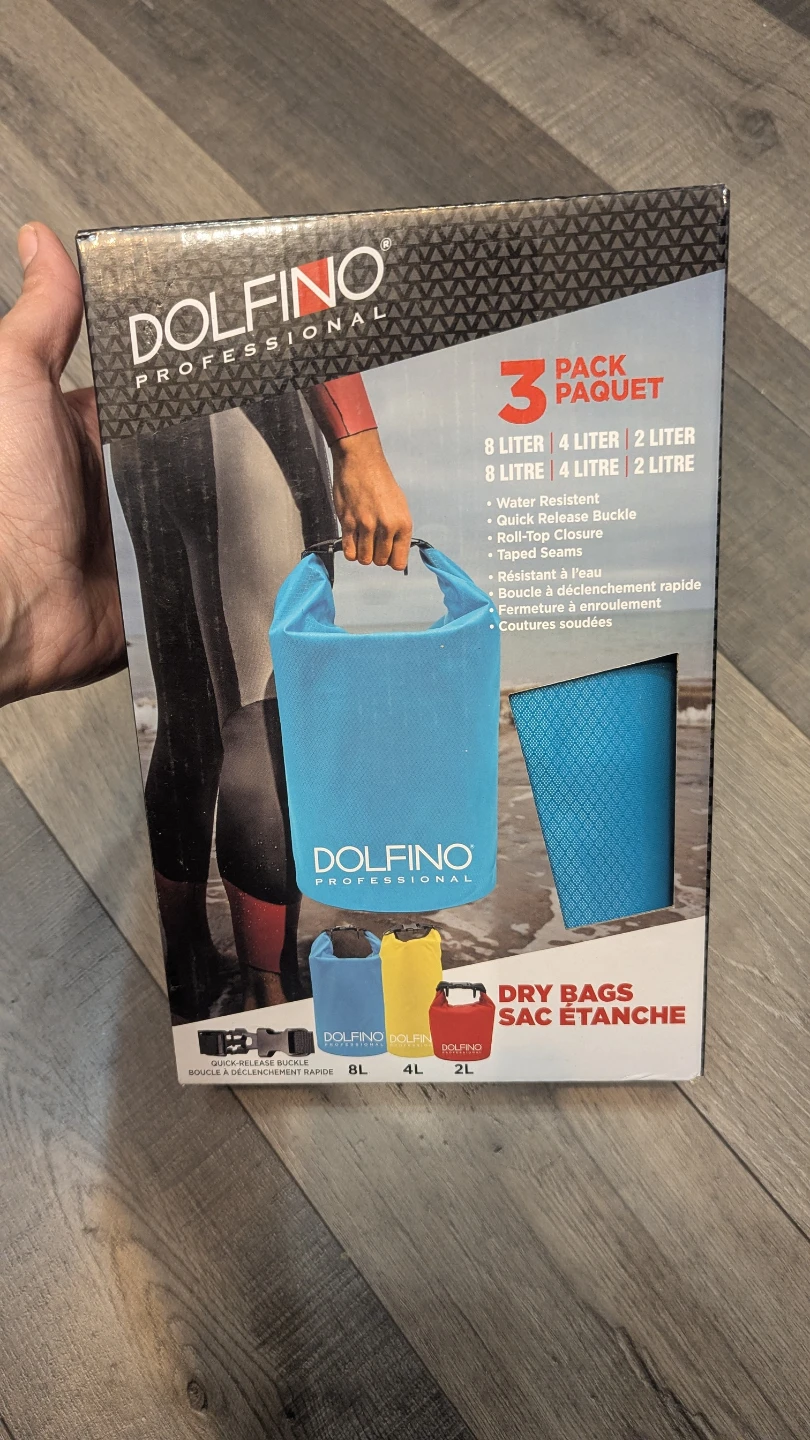 New Dolfino Professional dry bags! This is a 3-pack with different sizes: 8 liter, 4 liter, and 2 liter. Super handy for keeping your stuff dry. Has water resistant material, quick release buckle, roll-top closure, and taped seams.