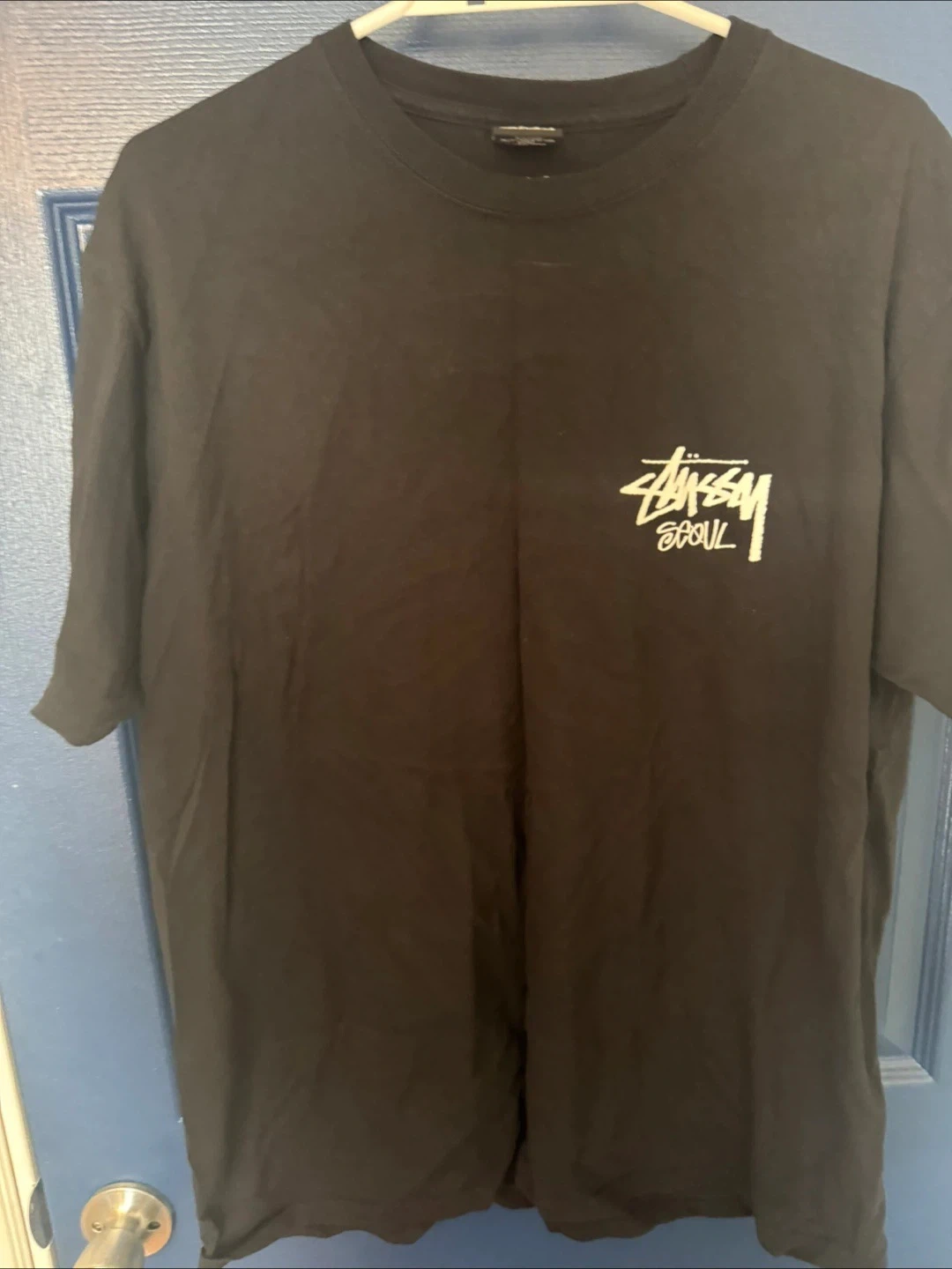Black Stussy T-shirt with "Stussy Seoul" graphic.