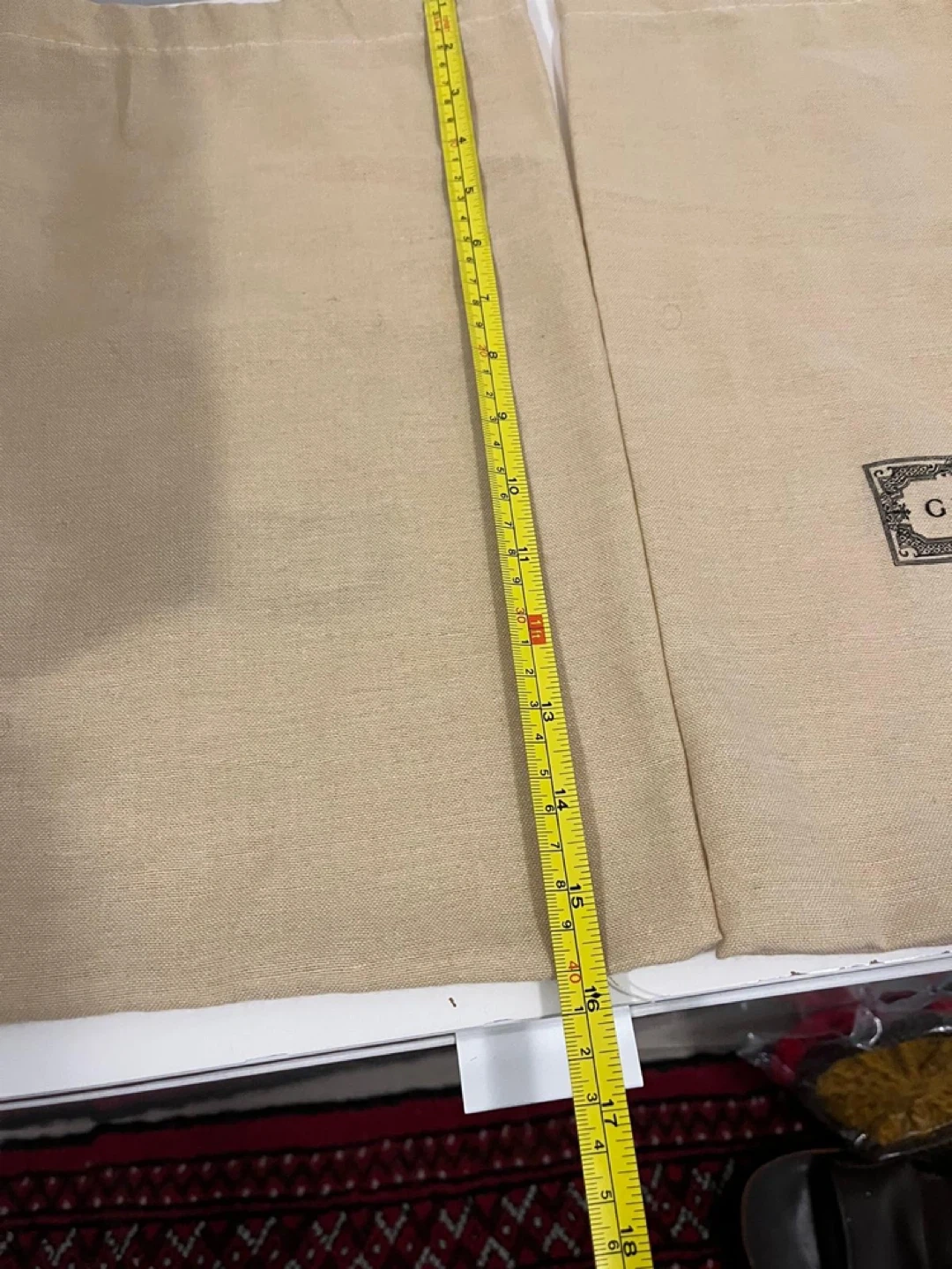 Two beige Gucci dust bags. Each bag measures approximately 16 inches tall and 12 inches wide. Made of soft, breathable fabric. Protects shoes or accessories.