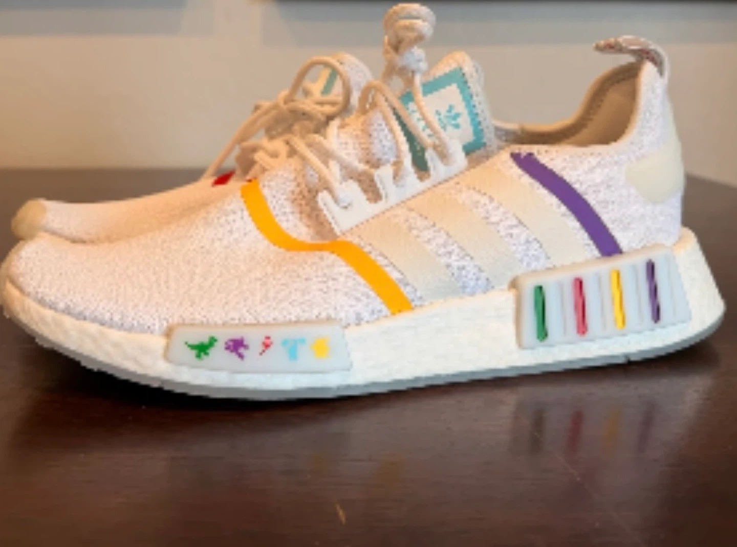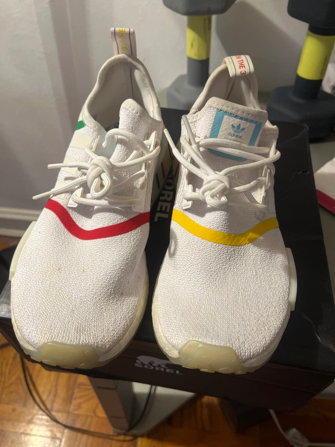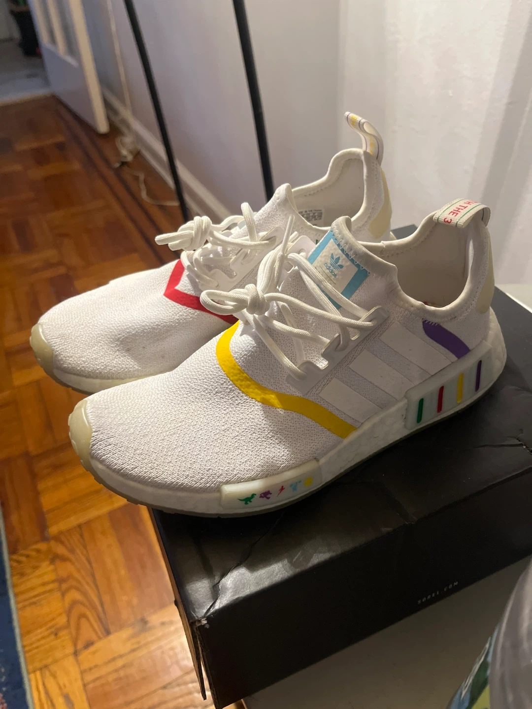 White Adidas NMD R1 sneakers with multicolor stripe accents. These shoes feature a breathable knit upper and a comfortable Boost midsole. Their unique design makes them a standout choice for casual wear. Size 7.5 on the item.