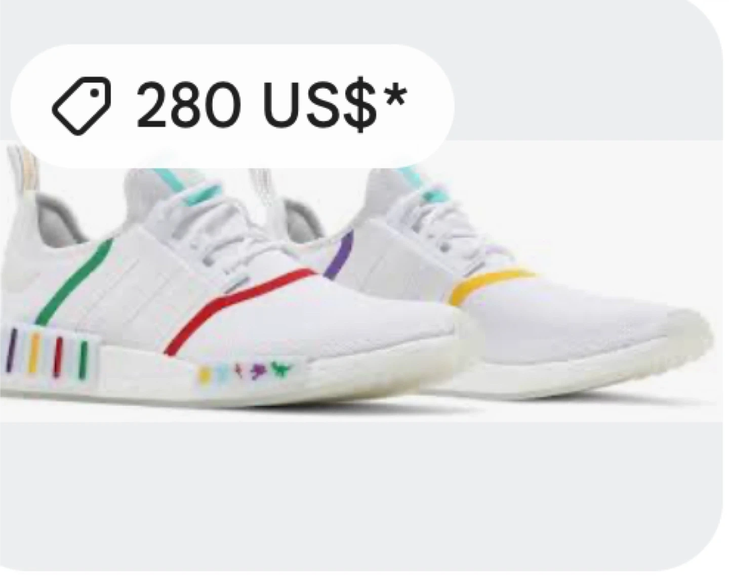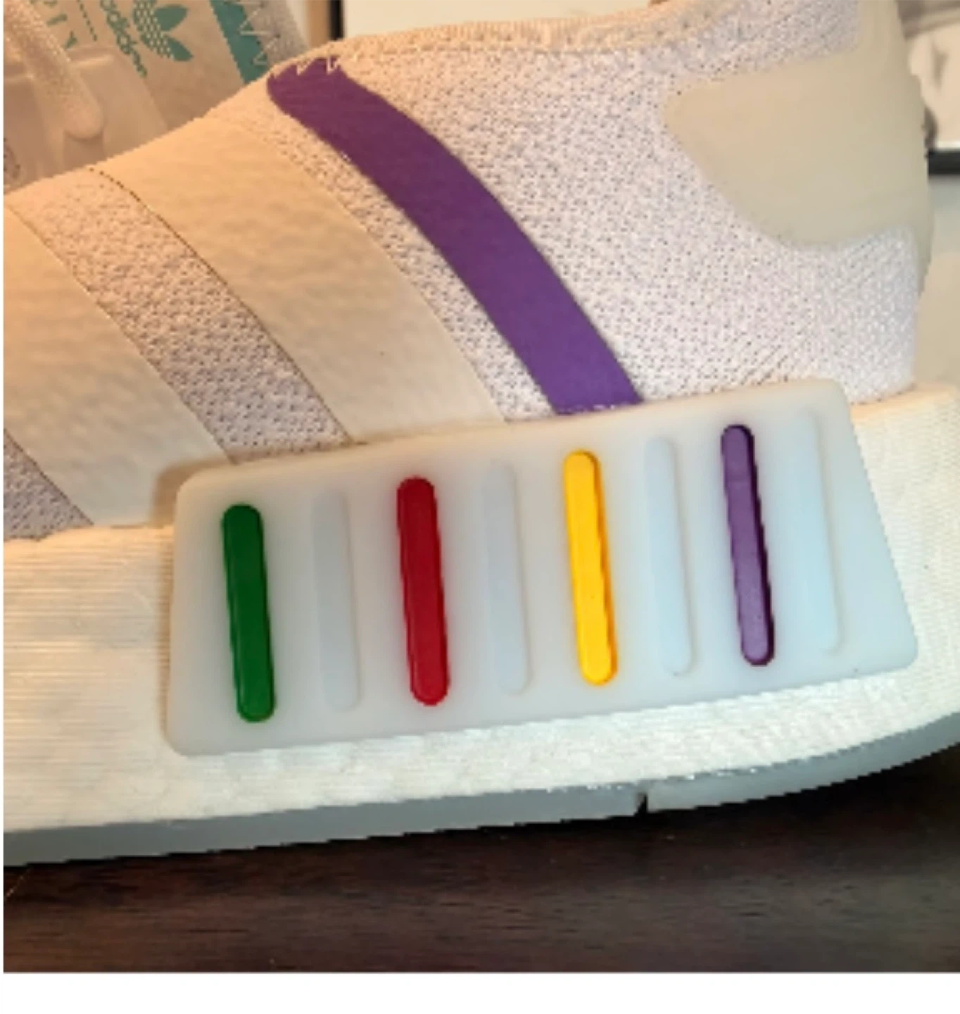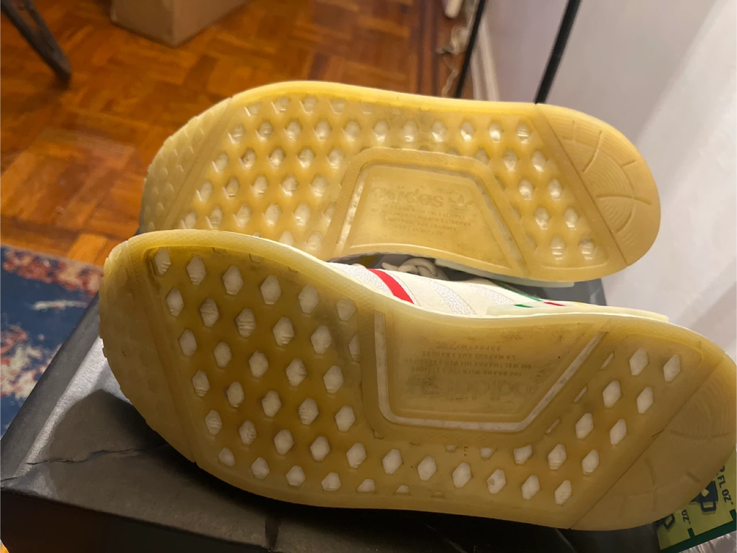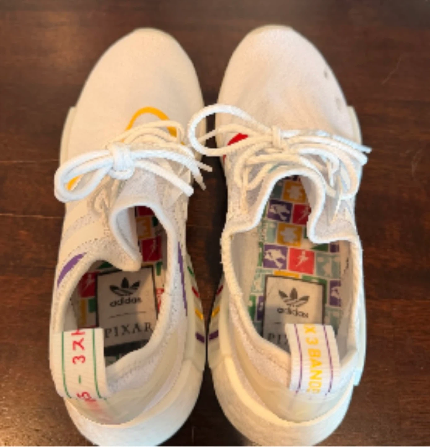 White Adidas NMD R1 sneakers with multicolor stripe accents. These shoes feature a breathable knit upper and a comfortable Boost midsole. Their unique design makes them a standout choice for casual wear. Size 7.5 on the item.