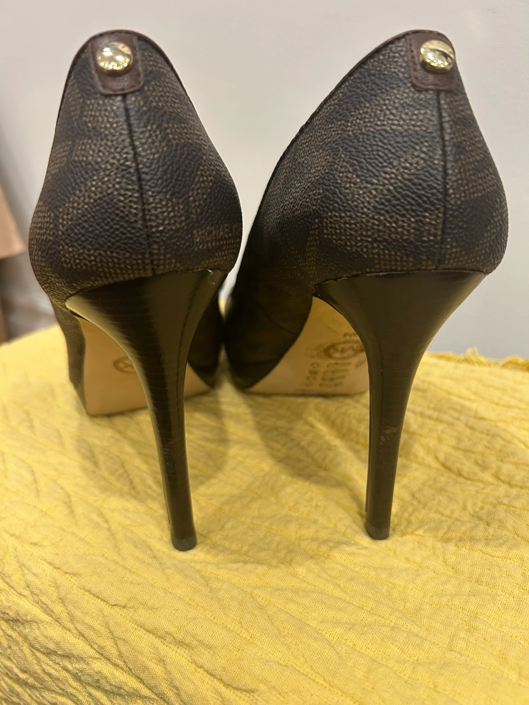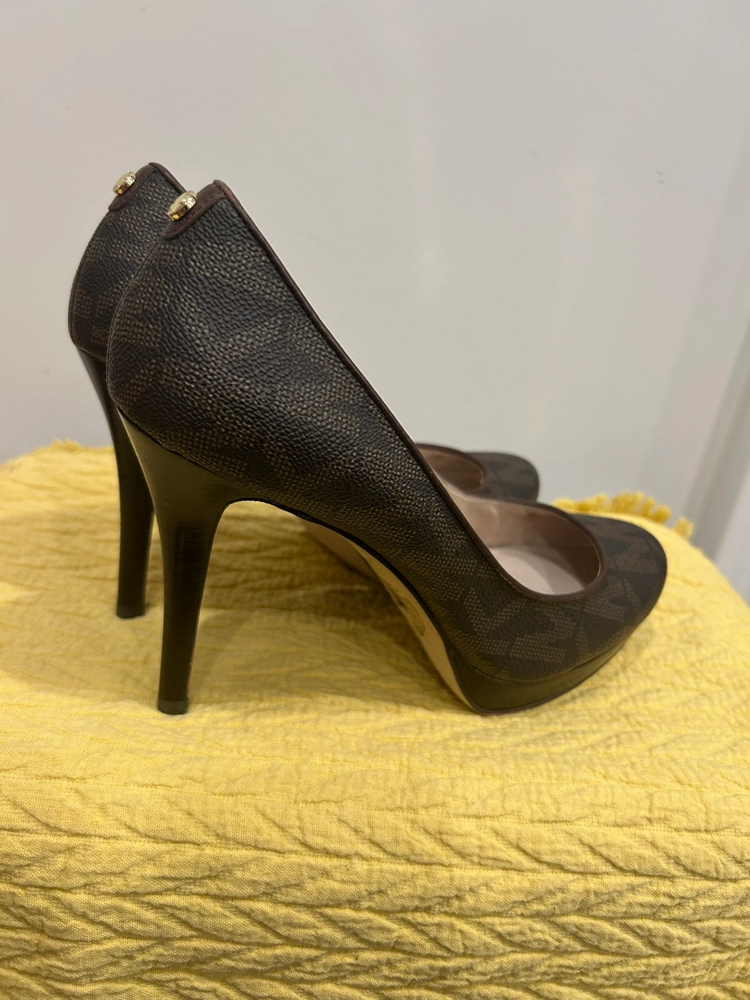 These are a pair of authentic Michael Kors heels with a brown patterned design. They are in good condition and ready for a new home! Pet and smoke free home.