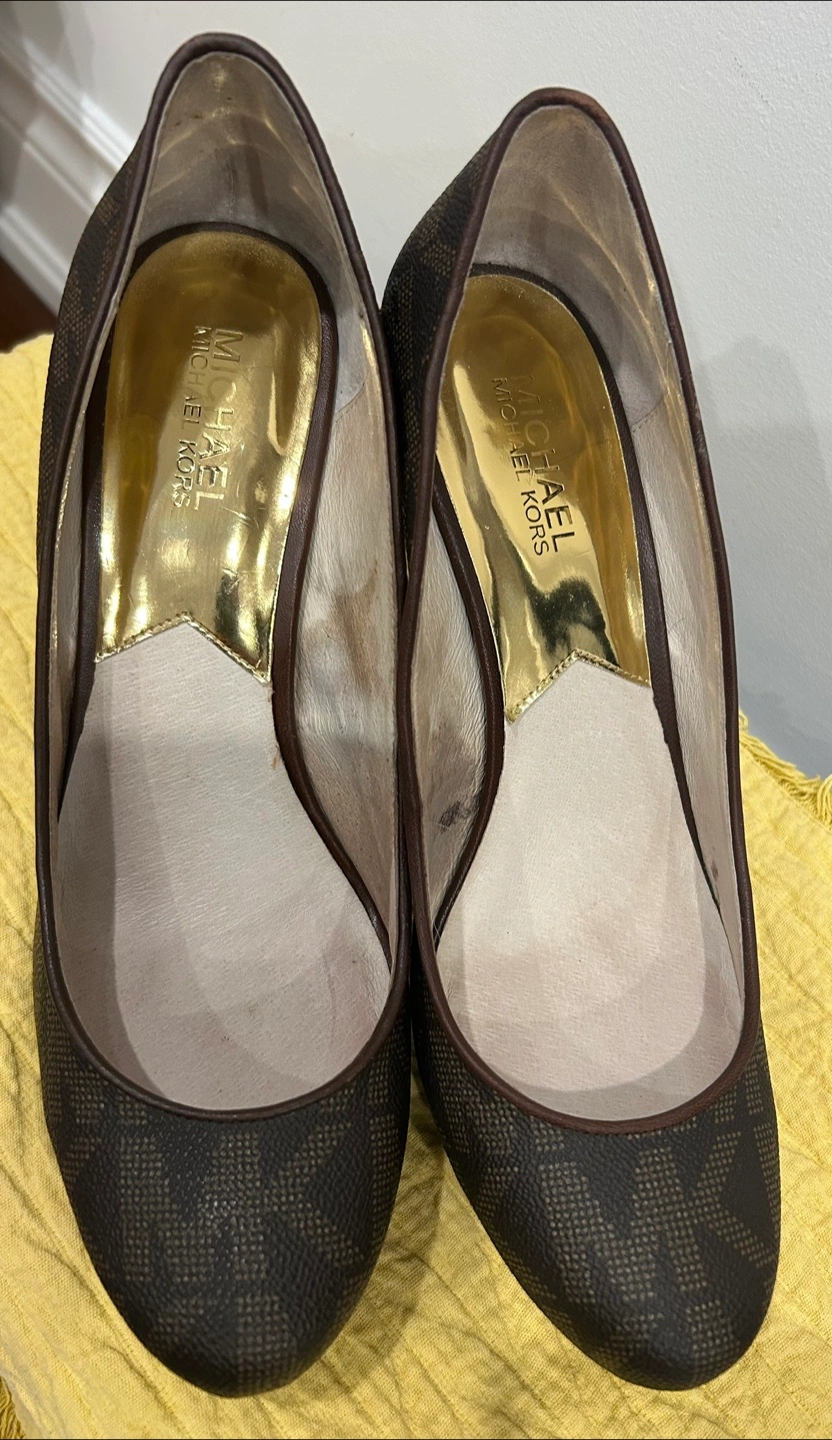 These are a pair of authentic Michael Kors heels with a brown patterned design. They are in good condition and ready for a new home! Pet and smoke free home.