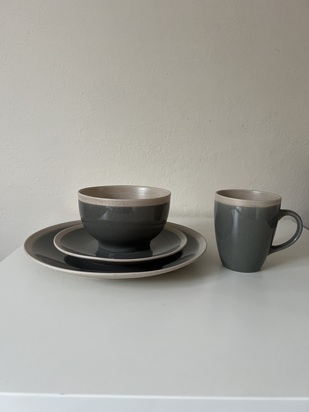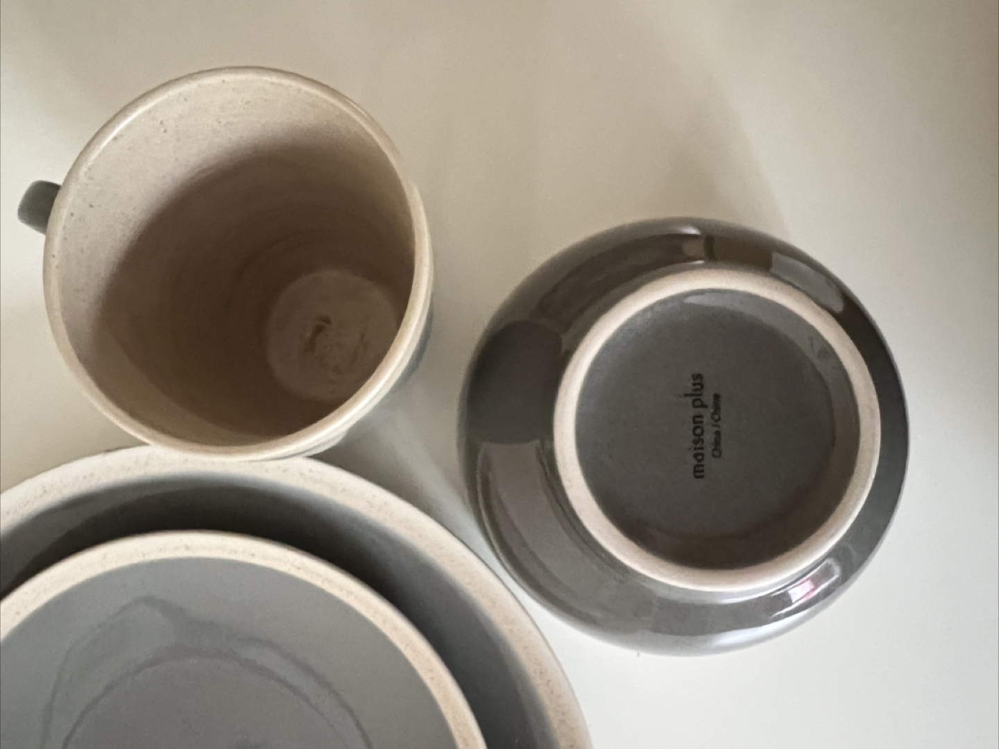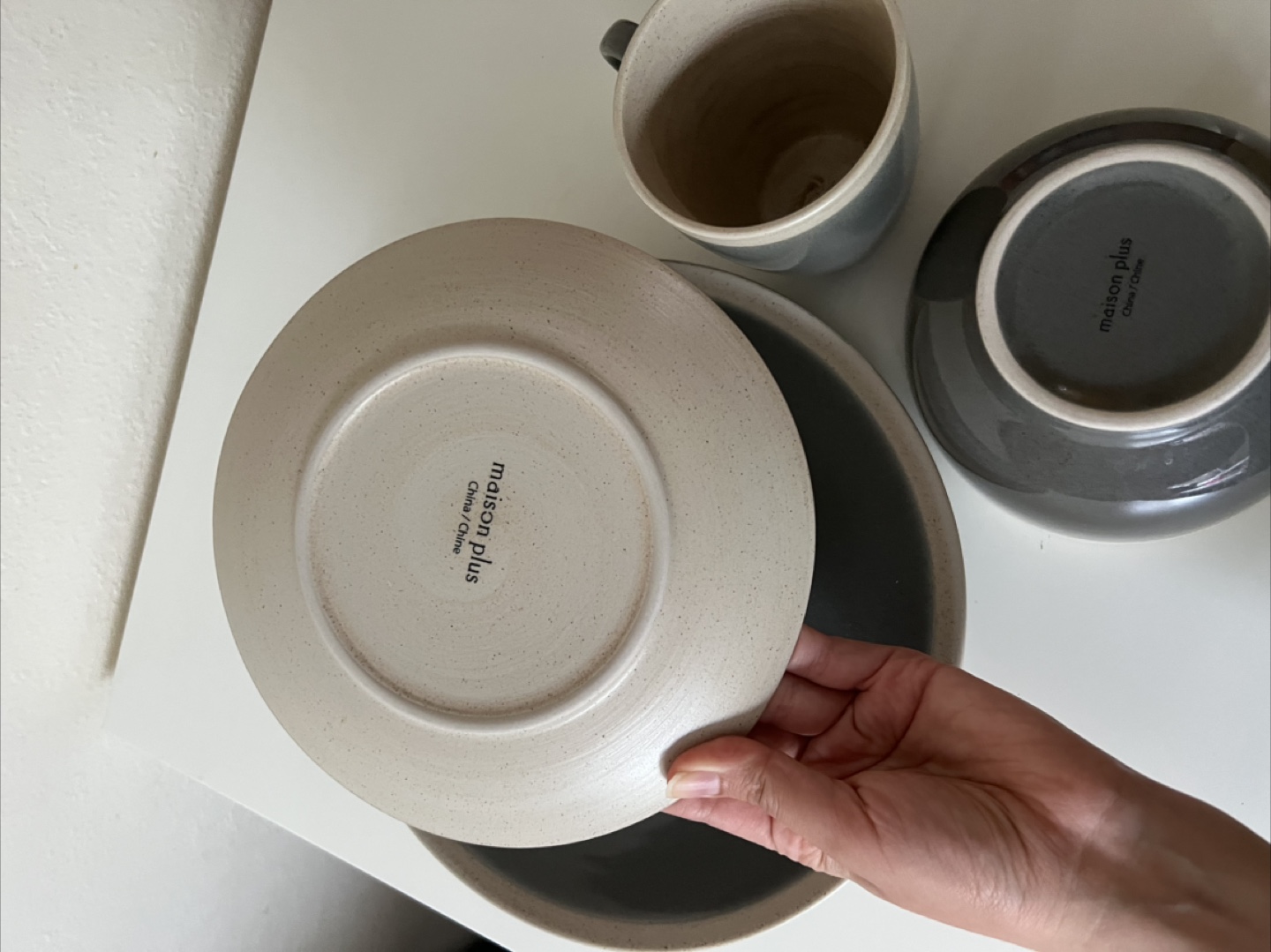 Selling a Maison Plus China dinnerware set! It includes a plate, bowl, and mug. The set is in great condition and would be a lovely addition to any kitchen