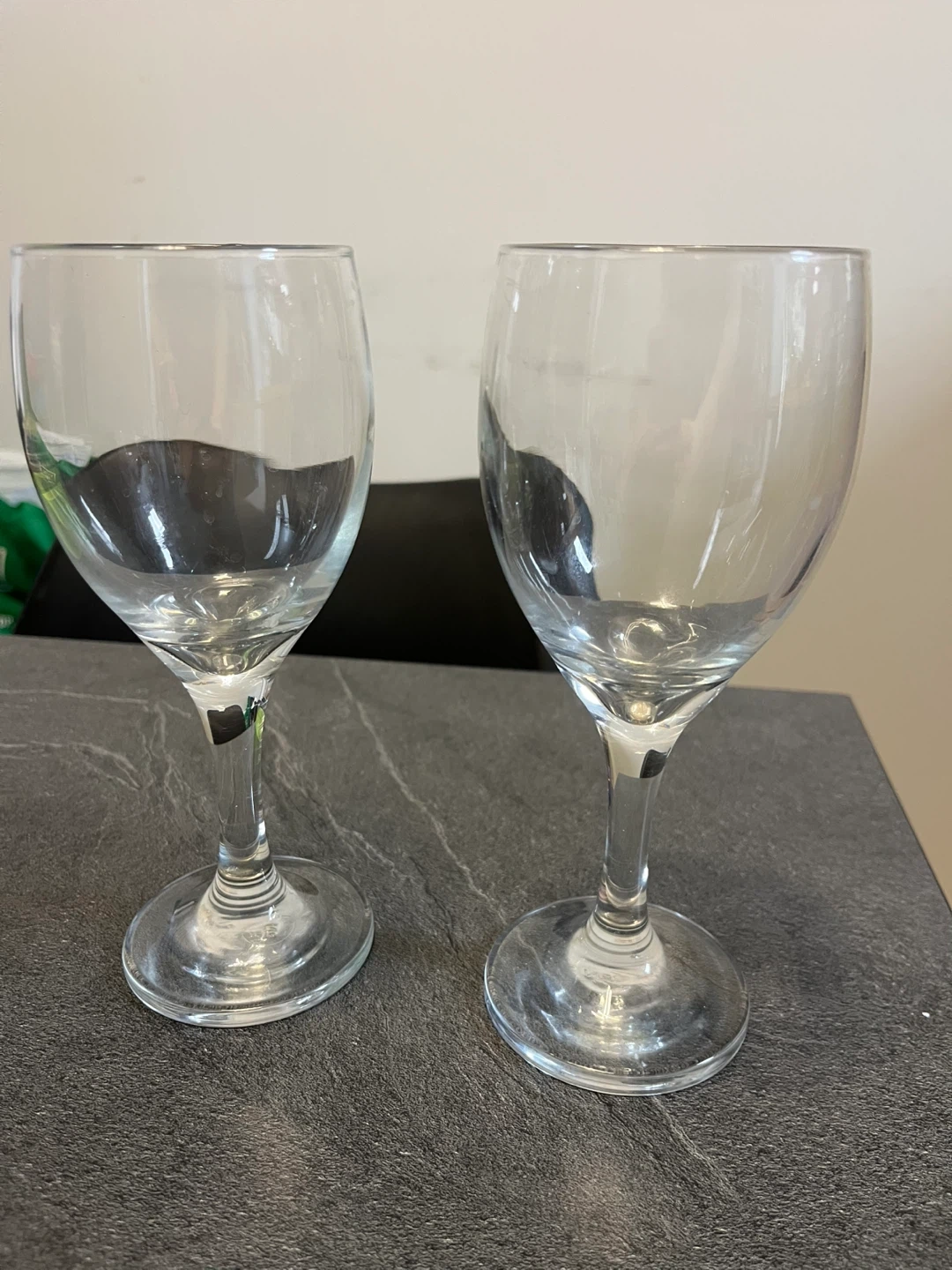 Two clear wine glasses with stems. Made of glass. Perfect for your next get-together!