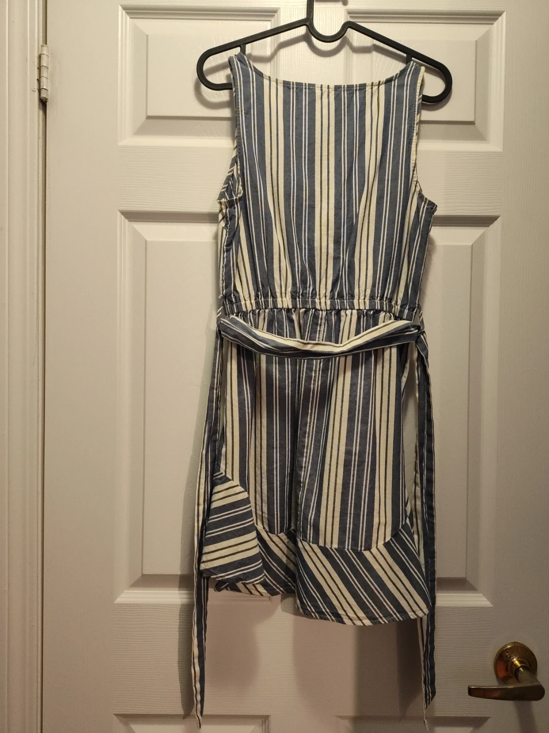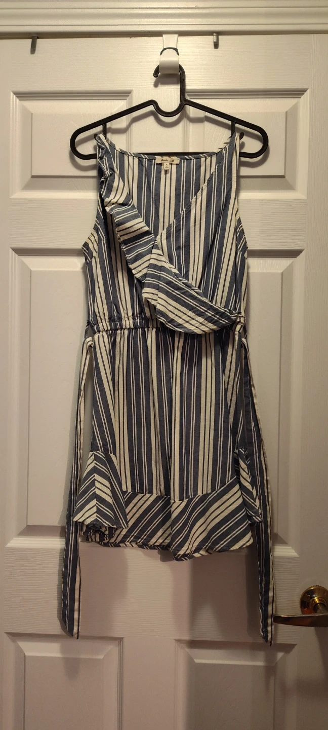 Here's a cute dress in a striped pattern! It's a size small and features a sleeveless design with a tie waist. Perfect for summer days!