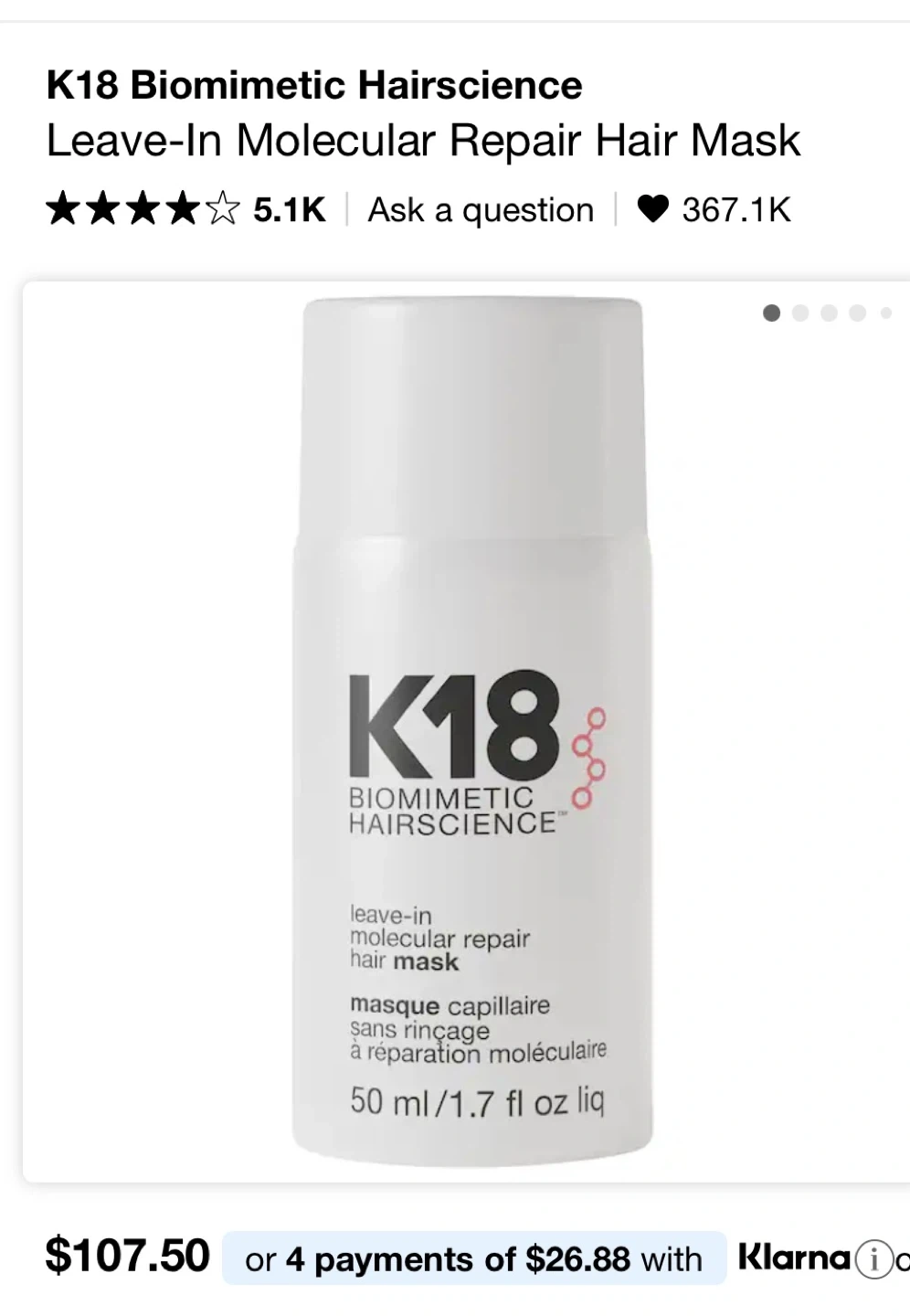 This is the K18 Biomimetic Hairscience leave-in molecular repair hair mask. It comes in a 50ml (1.7 fl oz liq) bottle. Retails for 107+tax