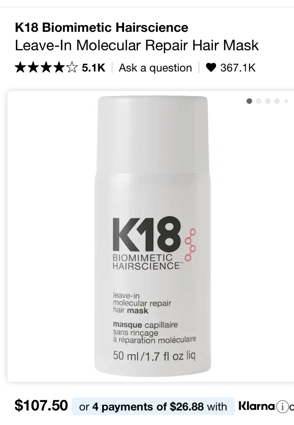This is the K18 Biomimetic Hairscience leave-in molecular repair hair mask. It comes in a 50ml (1.7 fl oz liq) bottle. Retails for 107+tax