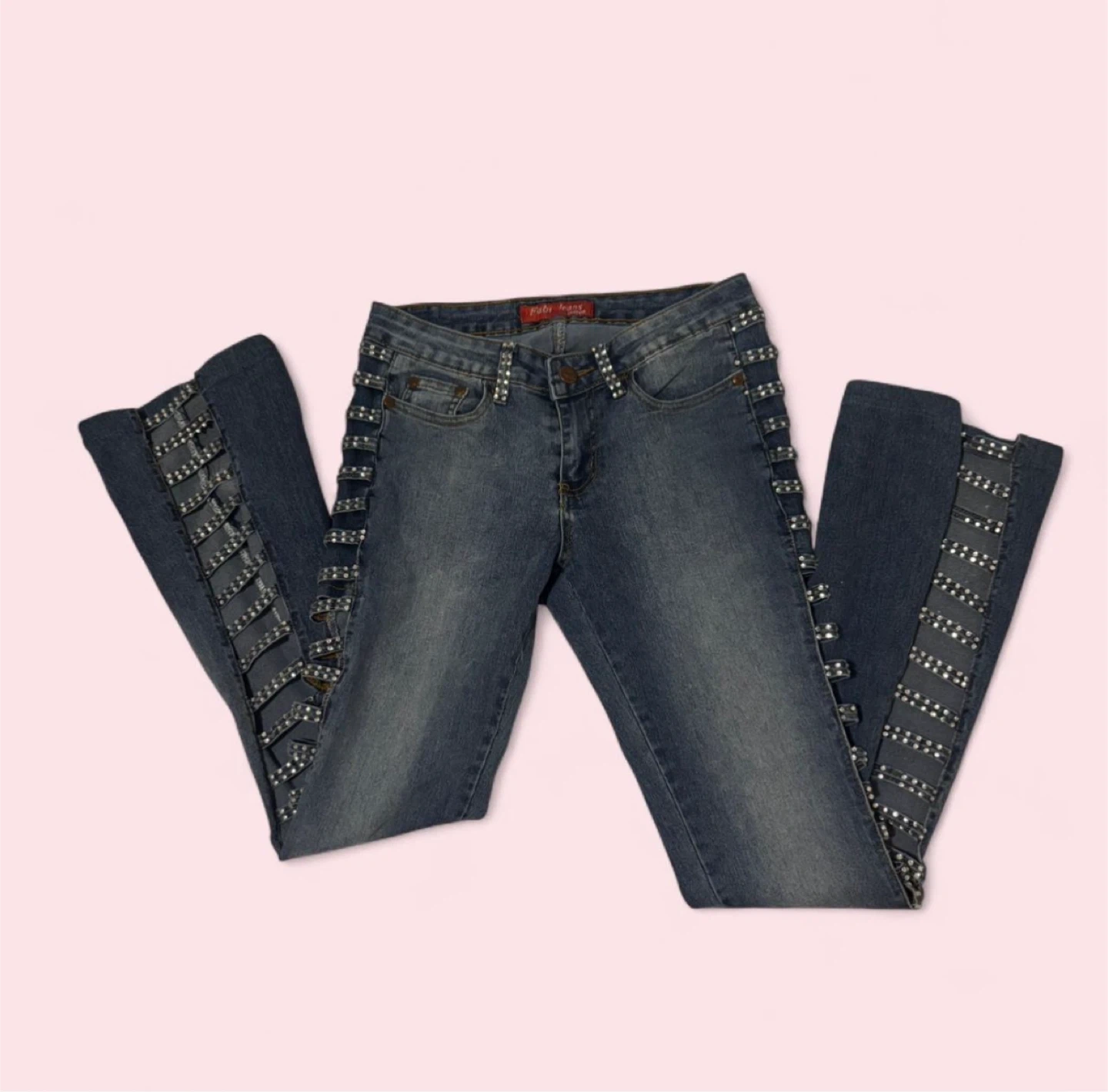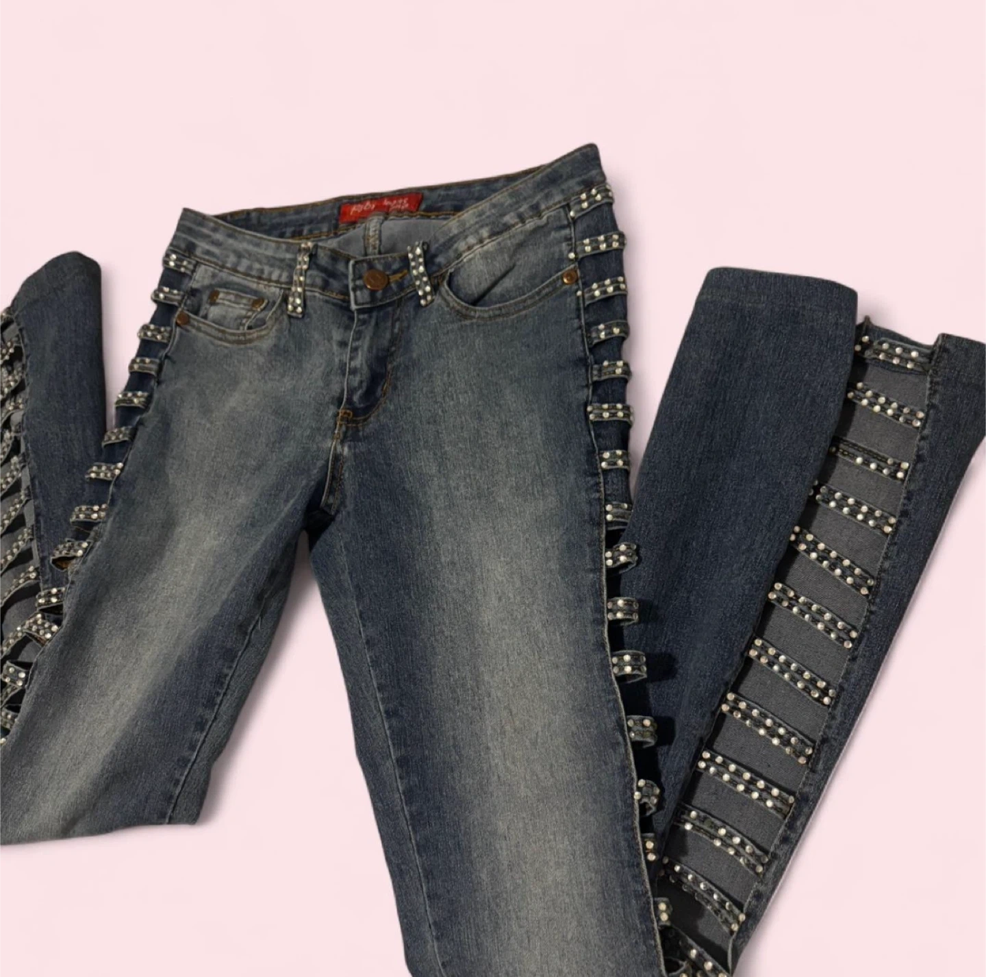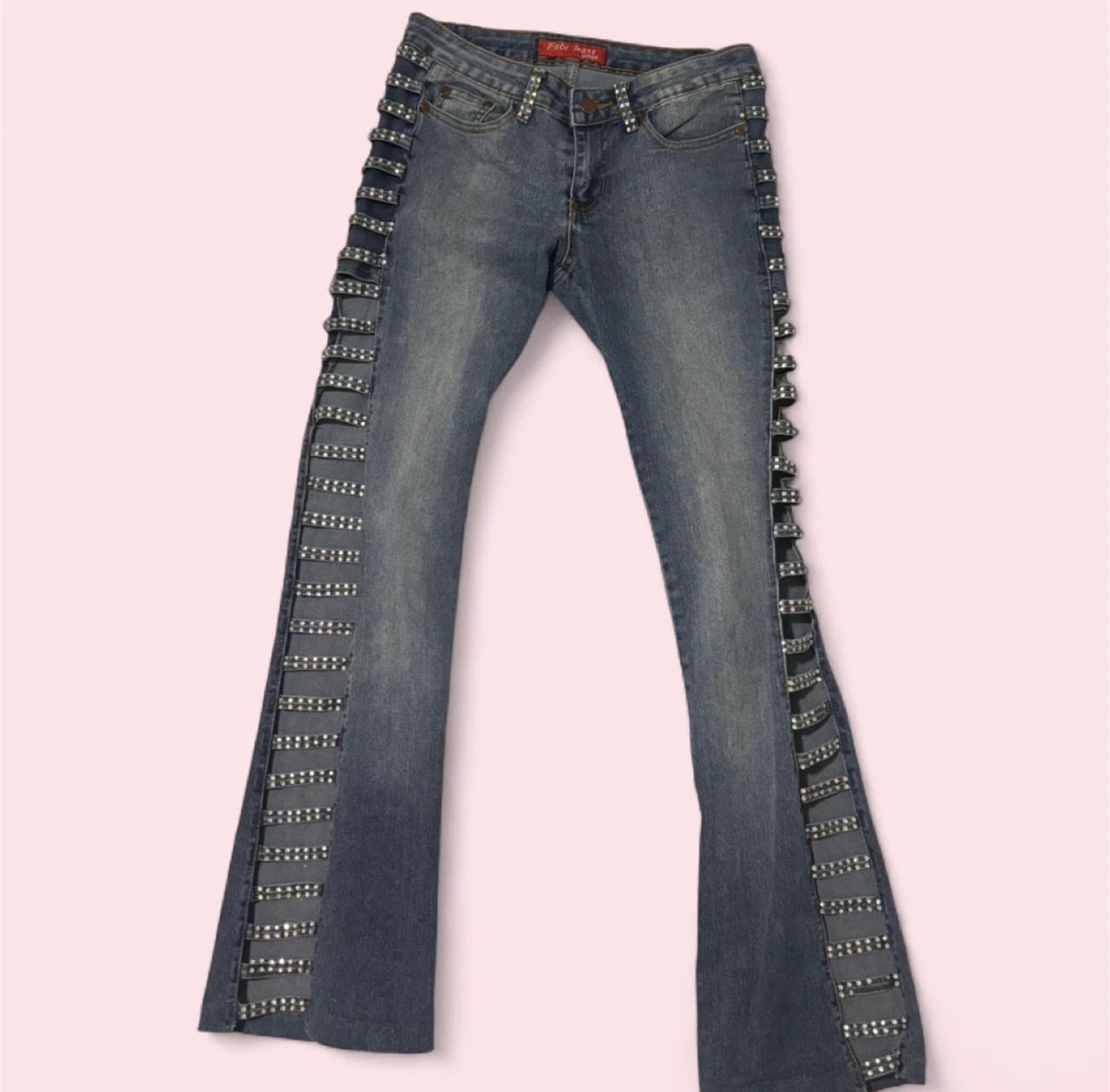 These Rusty Neal jeans are a size medium and feature a light wash denim with rhinestone embellishments along the sides. They have a trendy flare leg silhouette. Great for adding some sparkle to your outfit!