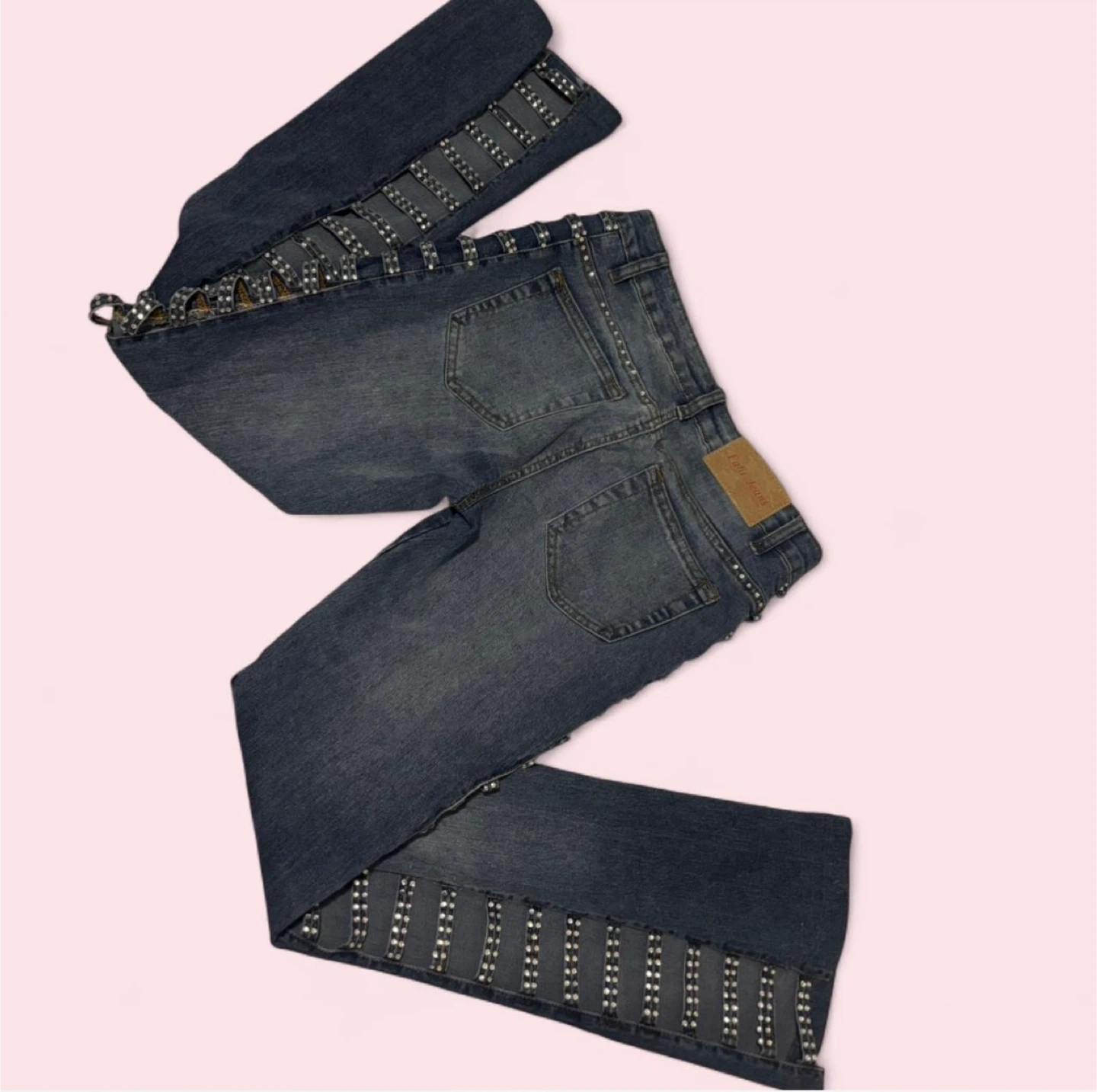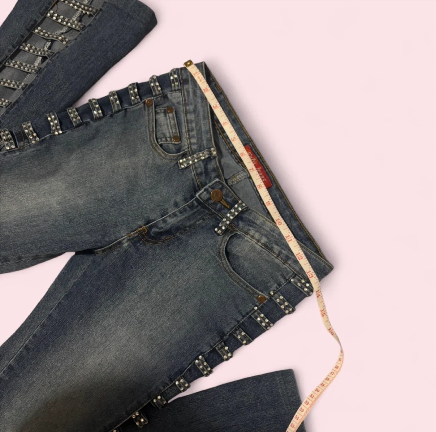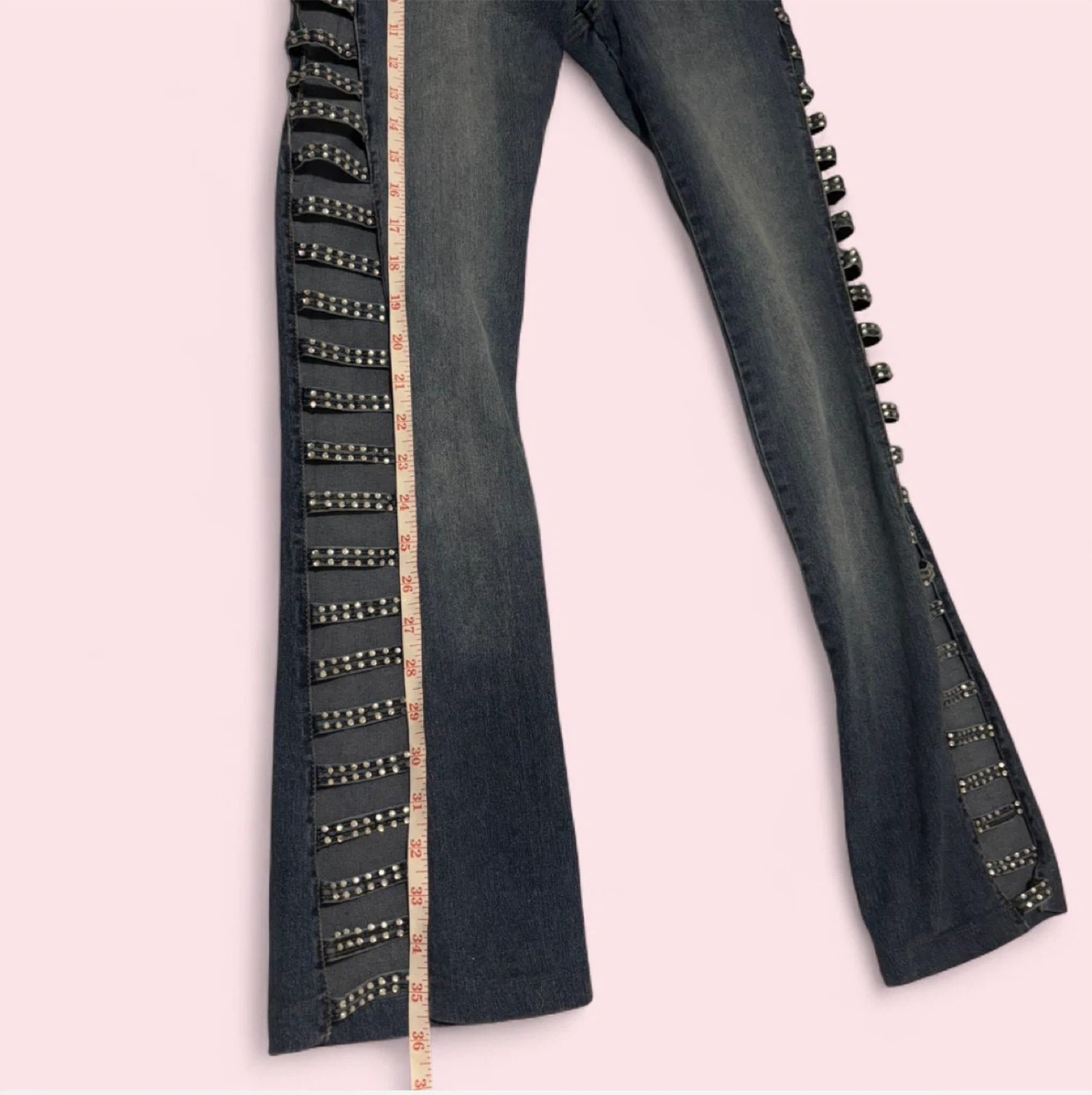 These Rusty Neal jeans are a size medium and feature a light wash denim with rhinestone embellishments along the sides. They have a trendy flare leg silhouette. Great for adding some sparkle to your outfit!