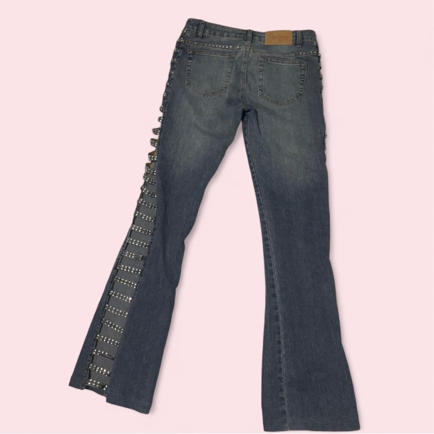 These Rusty Neal jeans are a size medium and feature a light wash denim with rhinestone embellishments along the sides. They have a trendy flare leg silhouette. Great for adding some sparkle to your outfit!